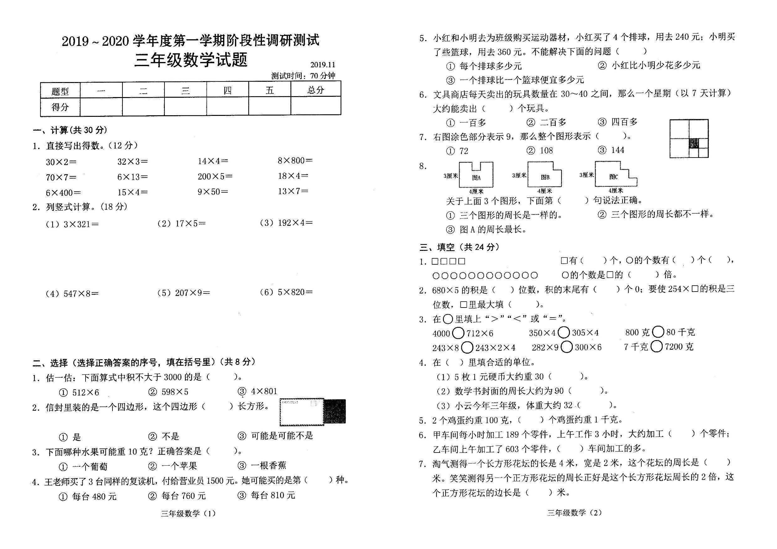 江苏省常州市2019-2020学年度第一学期期中阶段性调研测试三年级数学试题苏教版
