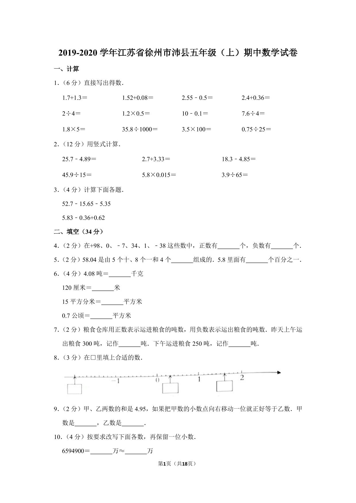 江苏省徐州市沛县2019-2020学年五年级(上)期中数学试卷苏教版