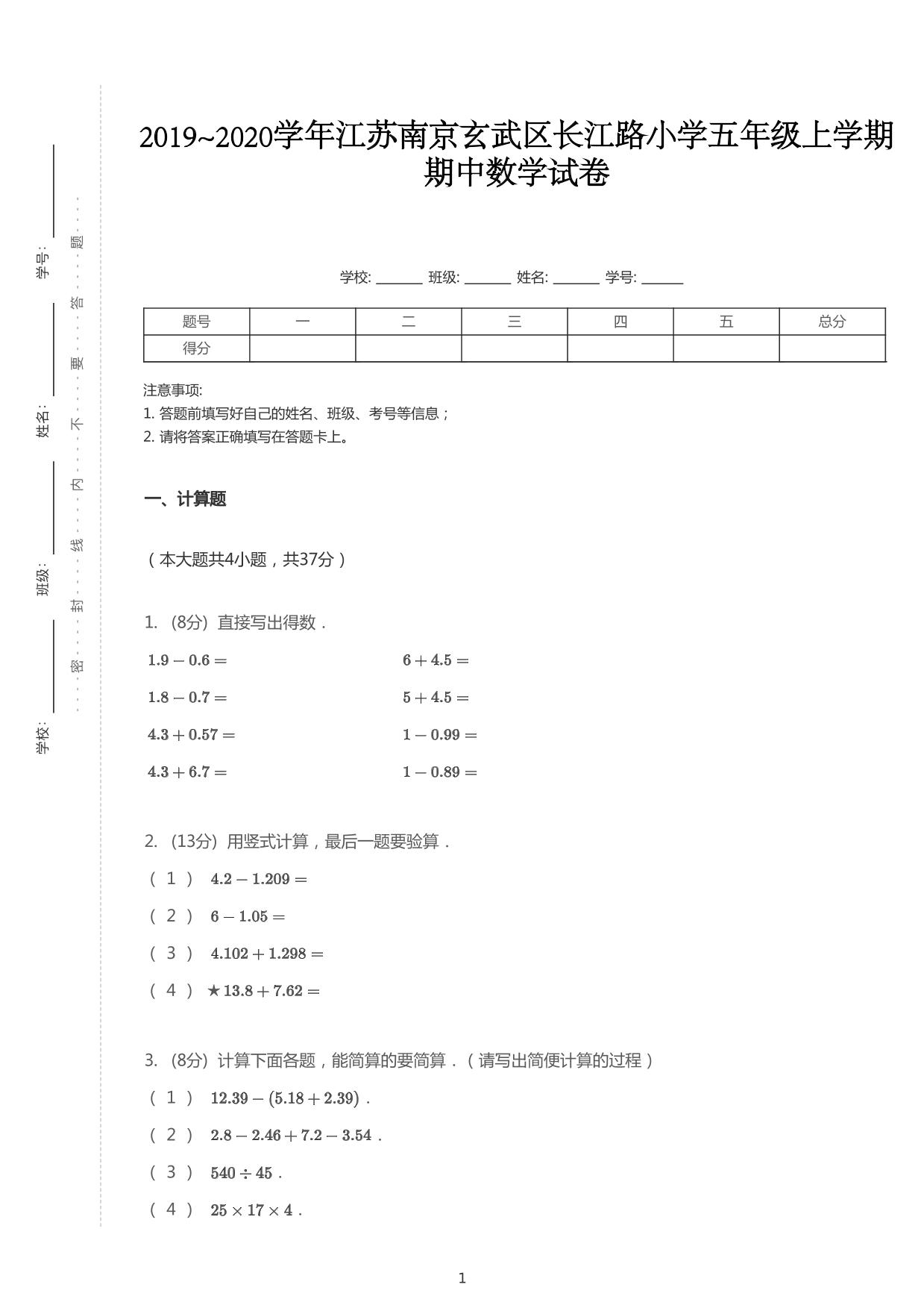 江苏省南京市玄武区长江路小学2019-2020学年五年级上学期期中数学试卷苏教版