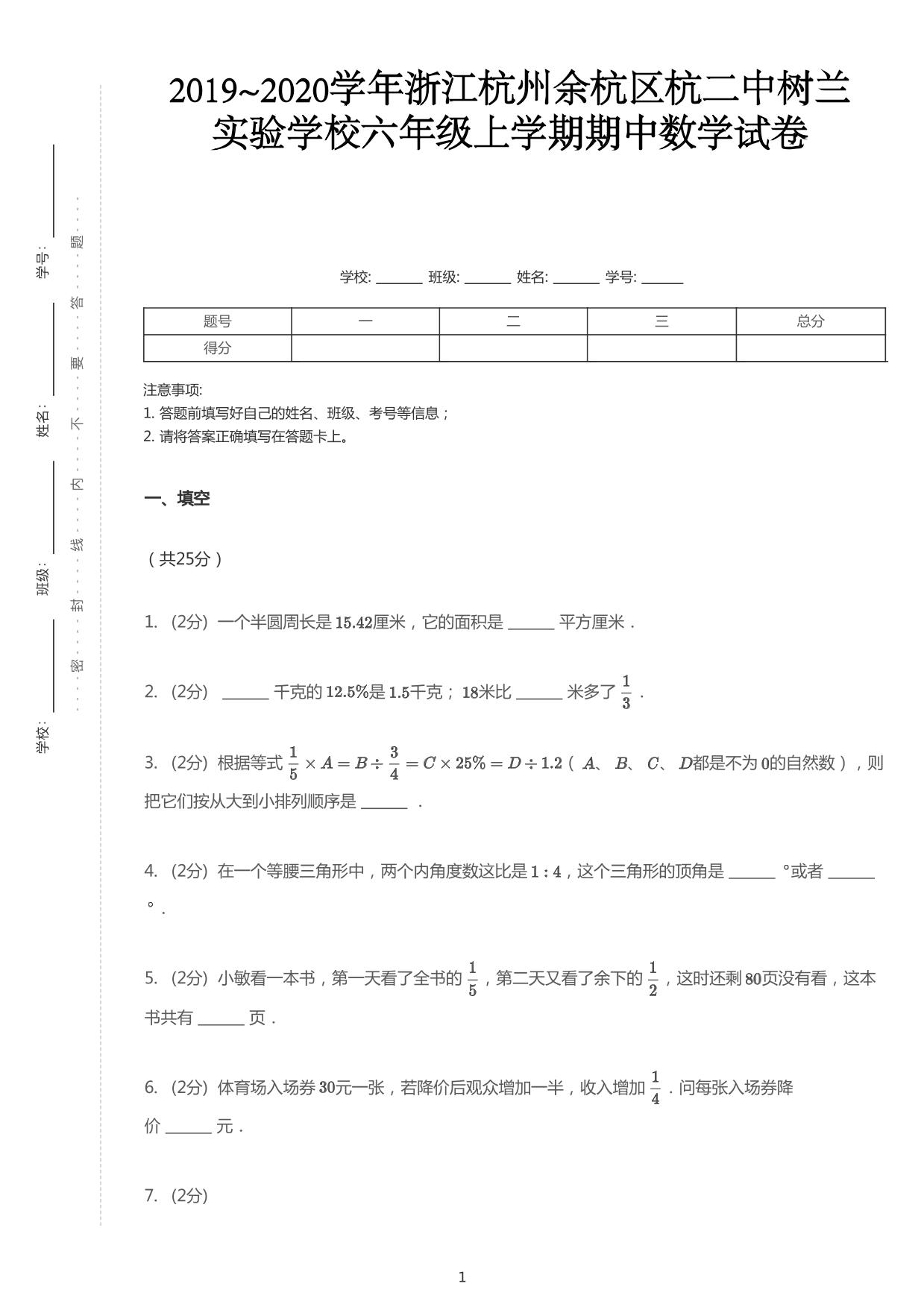 浙江省杭州市余杭区杭二中树兰实验学校2019-2020学年六年级上学期期中数学试卷人教版