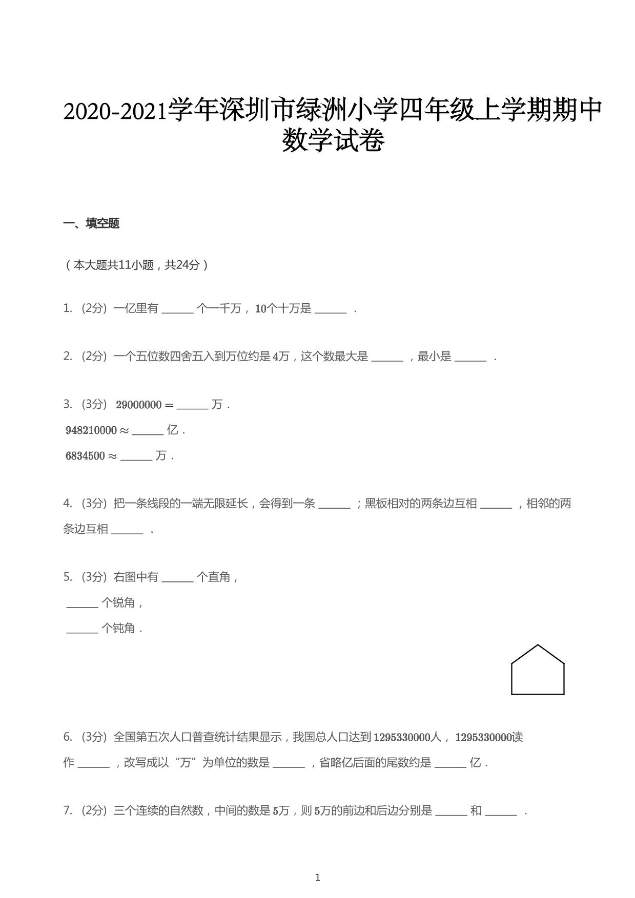 广东省深圳市福田区绿洲小学2020-2021学年四年级上学期期中数学试卷人教版