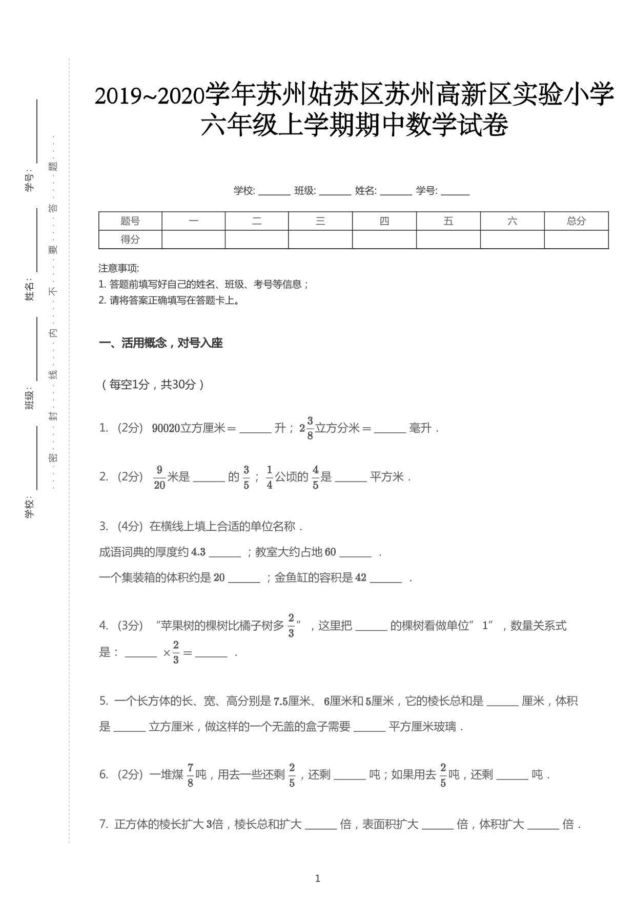 江苏省苏州市姑苏区高新区实验小学2019-2020学年六年级上学期期中数学试卷苏教版正文