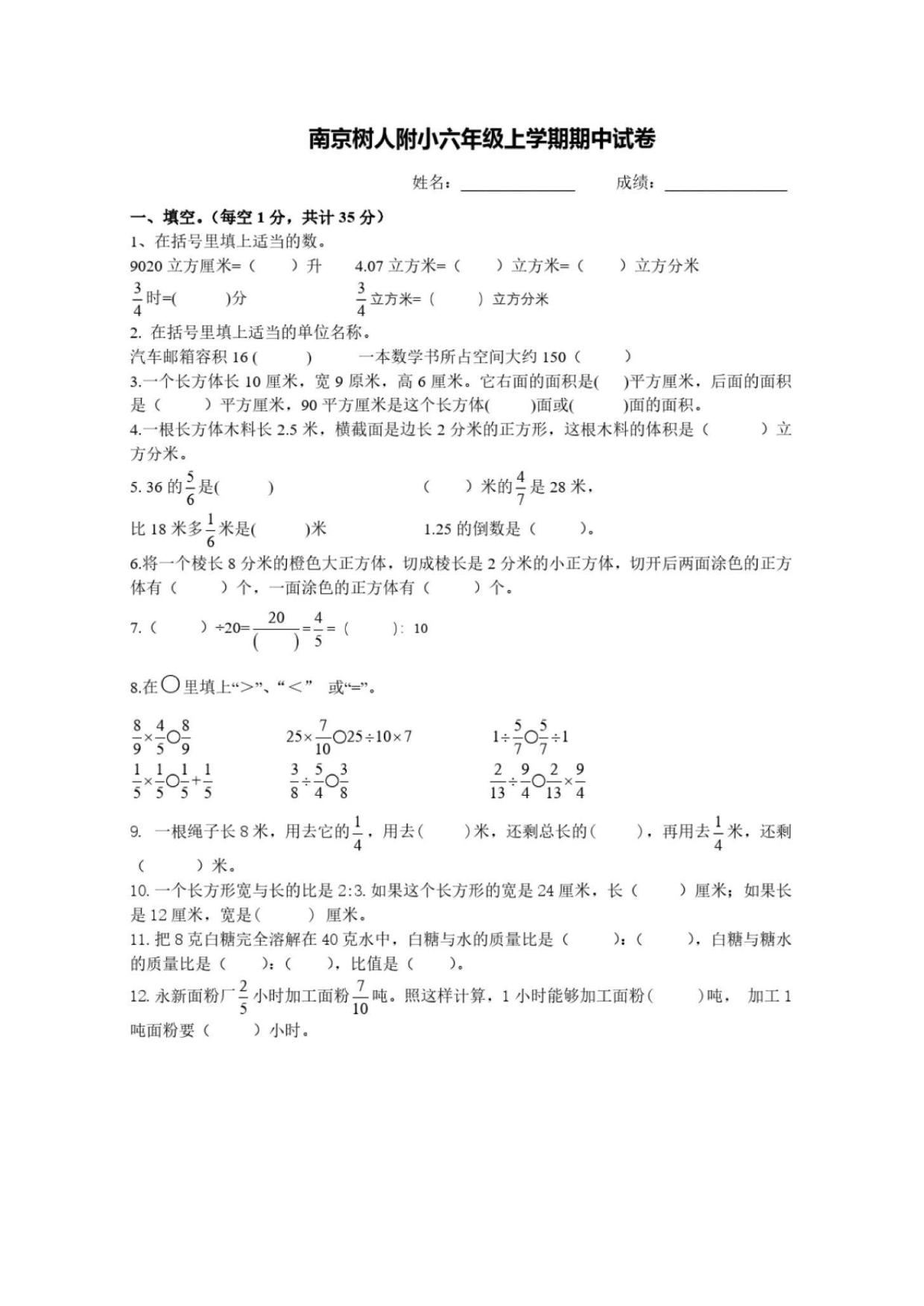 江苏省南京市树人附小2019-2020学年六年级上学期期中试卷苏教版