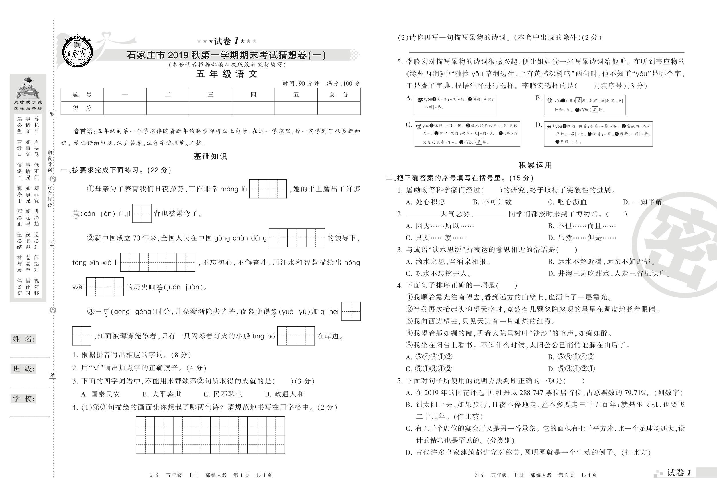2019-2020学年第一学期石家庄市猜想卷(一)五年级语文试卷(人教版)【1】