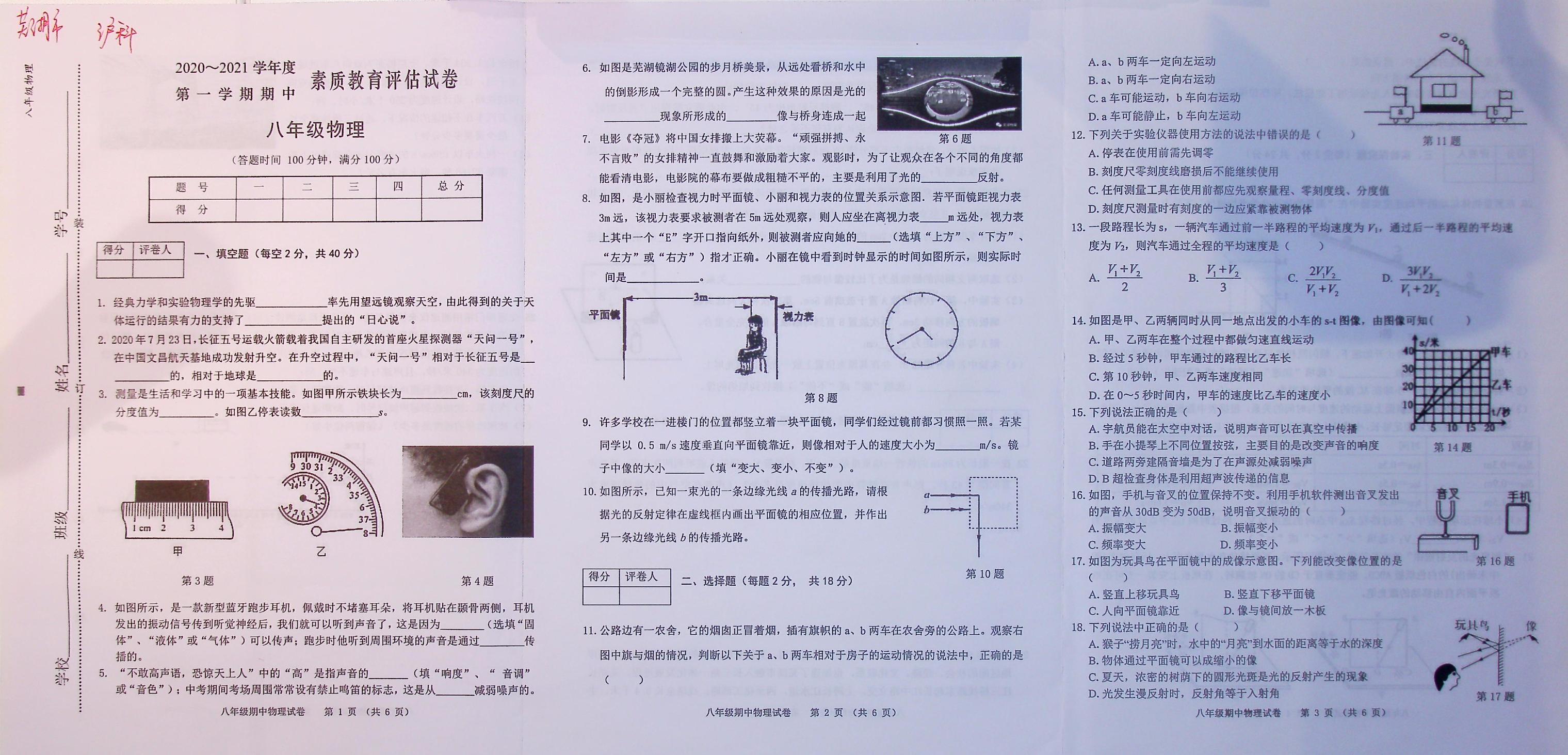 芜湖市2020-2021学年度第一学期期中素质教育评估试卷八年级物理沪科版