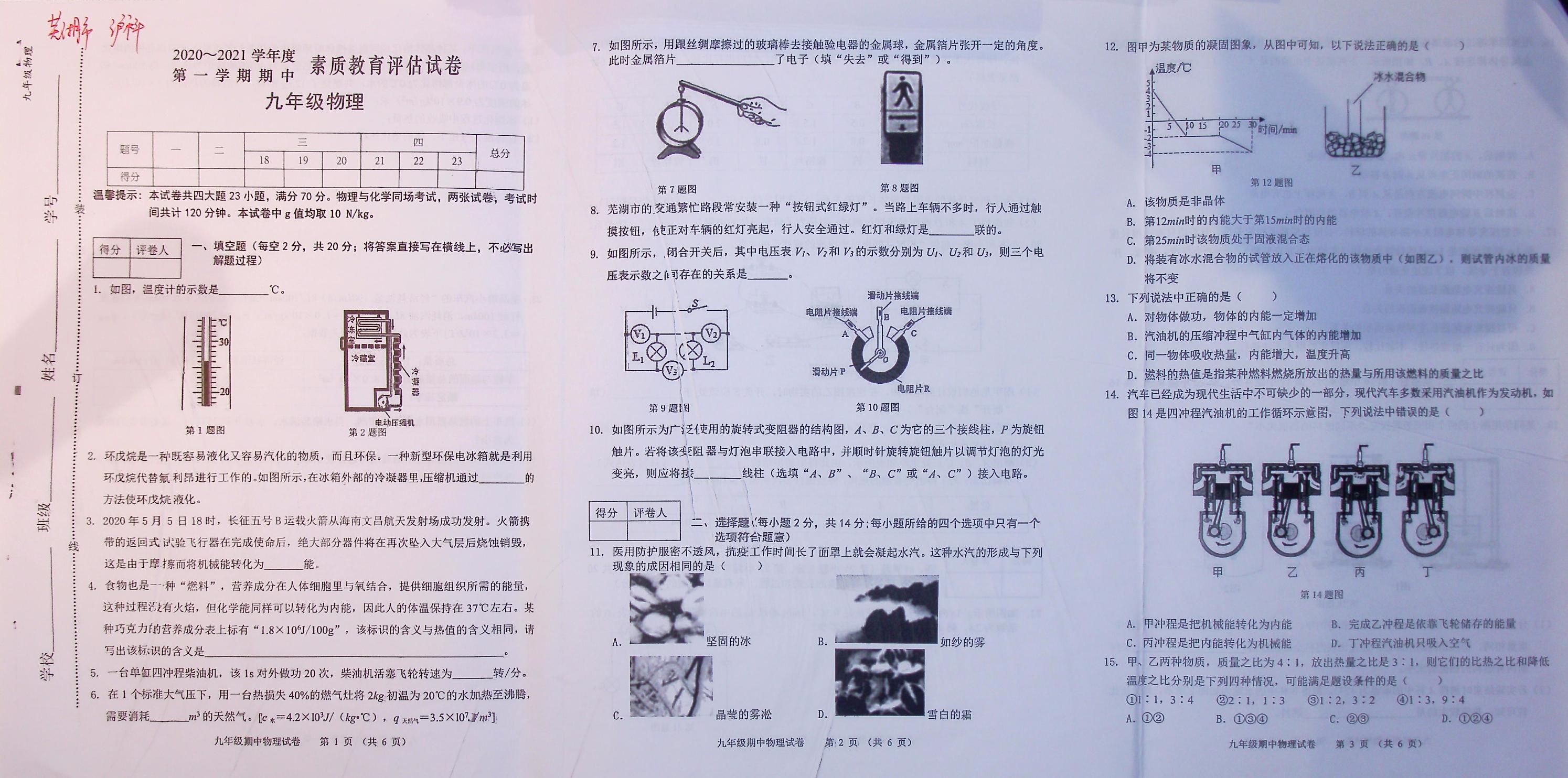 芜湖市2020-2021学年度第一学期期中素质教育评估试卷九年级物理沪科版