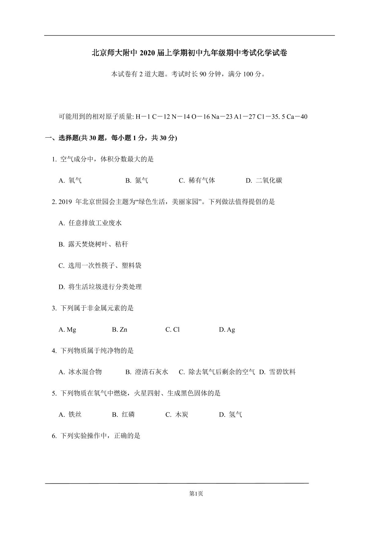 北京师大附中2020届上学期初中九年级期中考试化学试卷人教版