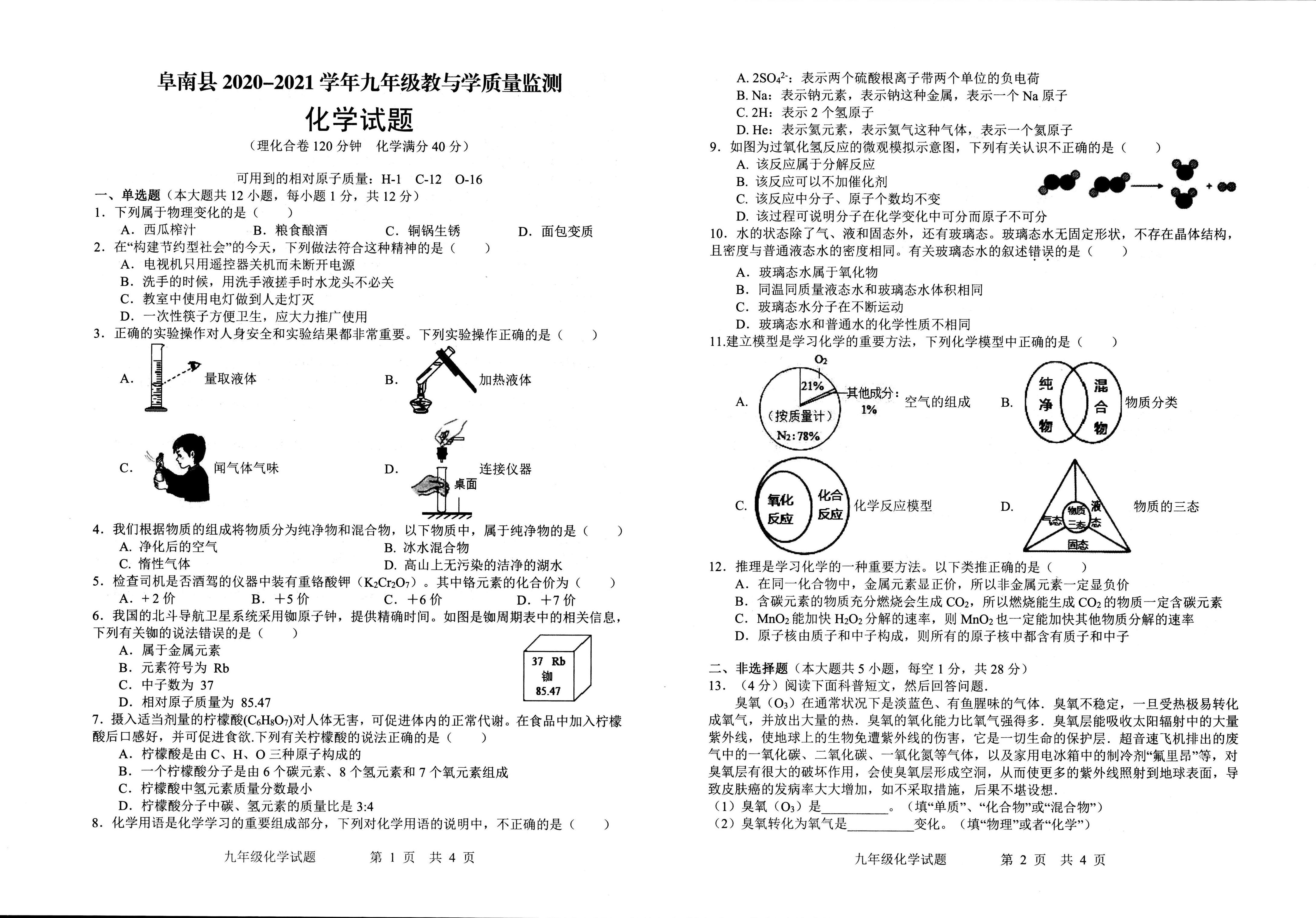阜南县2020-2021学年九年级教与学质量检测化学试题人教版