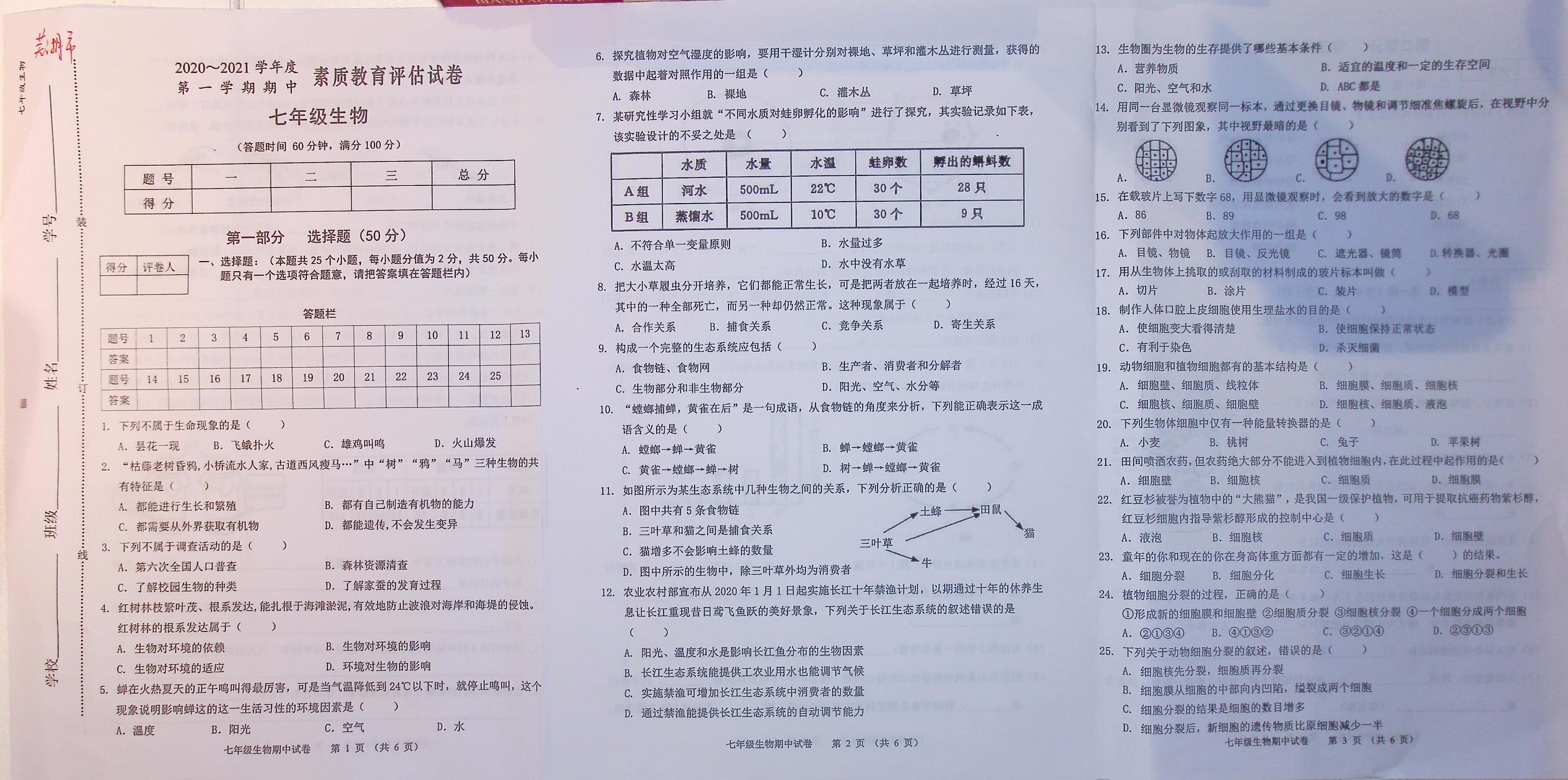 七年级生物人教版上册期中卷