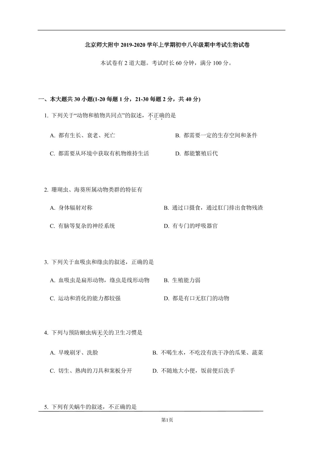 北京师大附中2019-2020学年上学期初中八年级期中考试生物试卷人教版