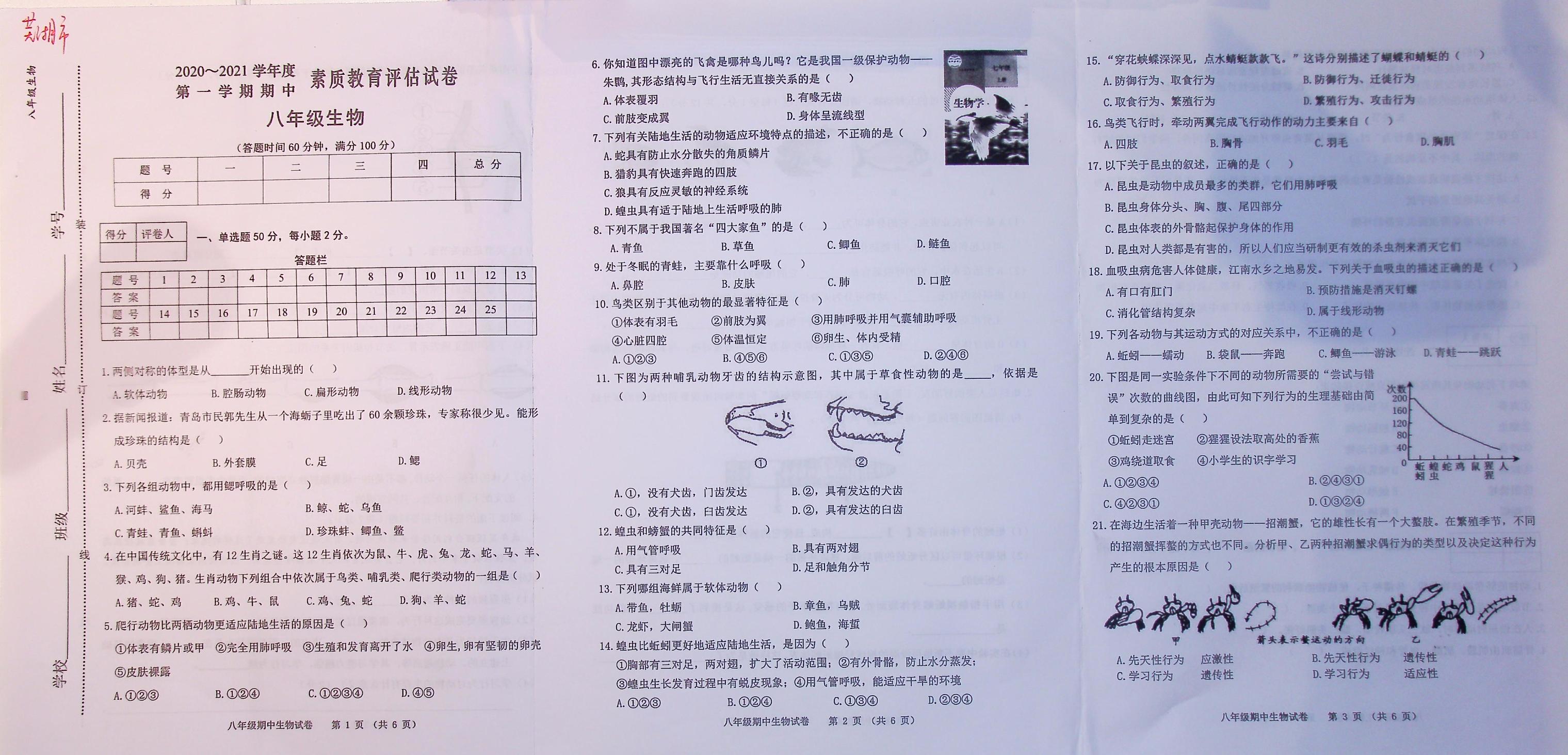 芜湖市2020-2021学年度第一学期期中素质教育评估试卷八年级生物人教版