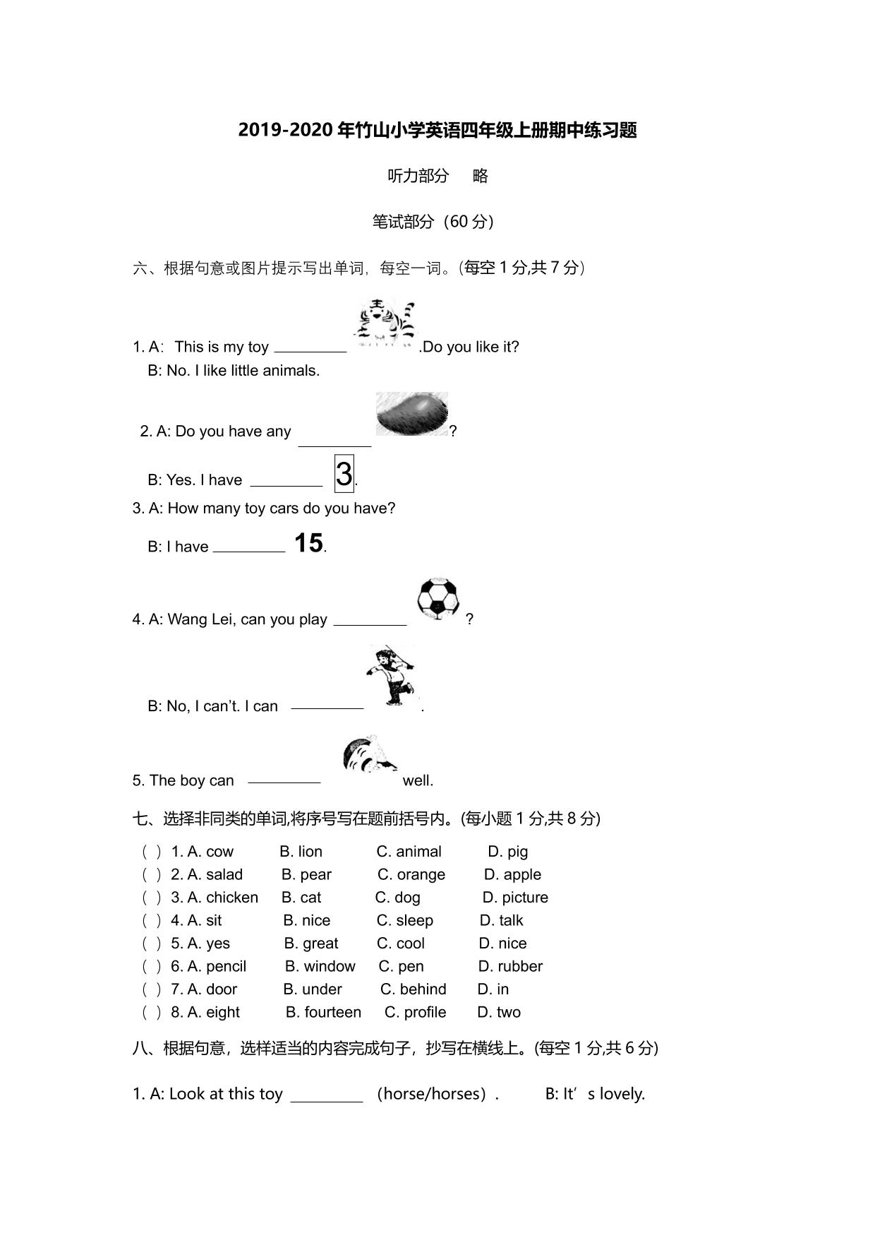 江苏省南京市江宁区竹山小学2019-2020年英语四年级上册期中练习题(译林版)【无听力音频】