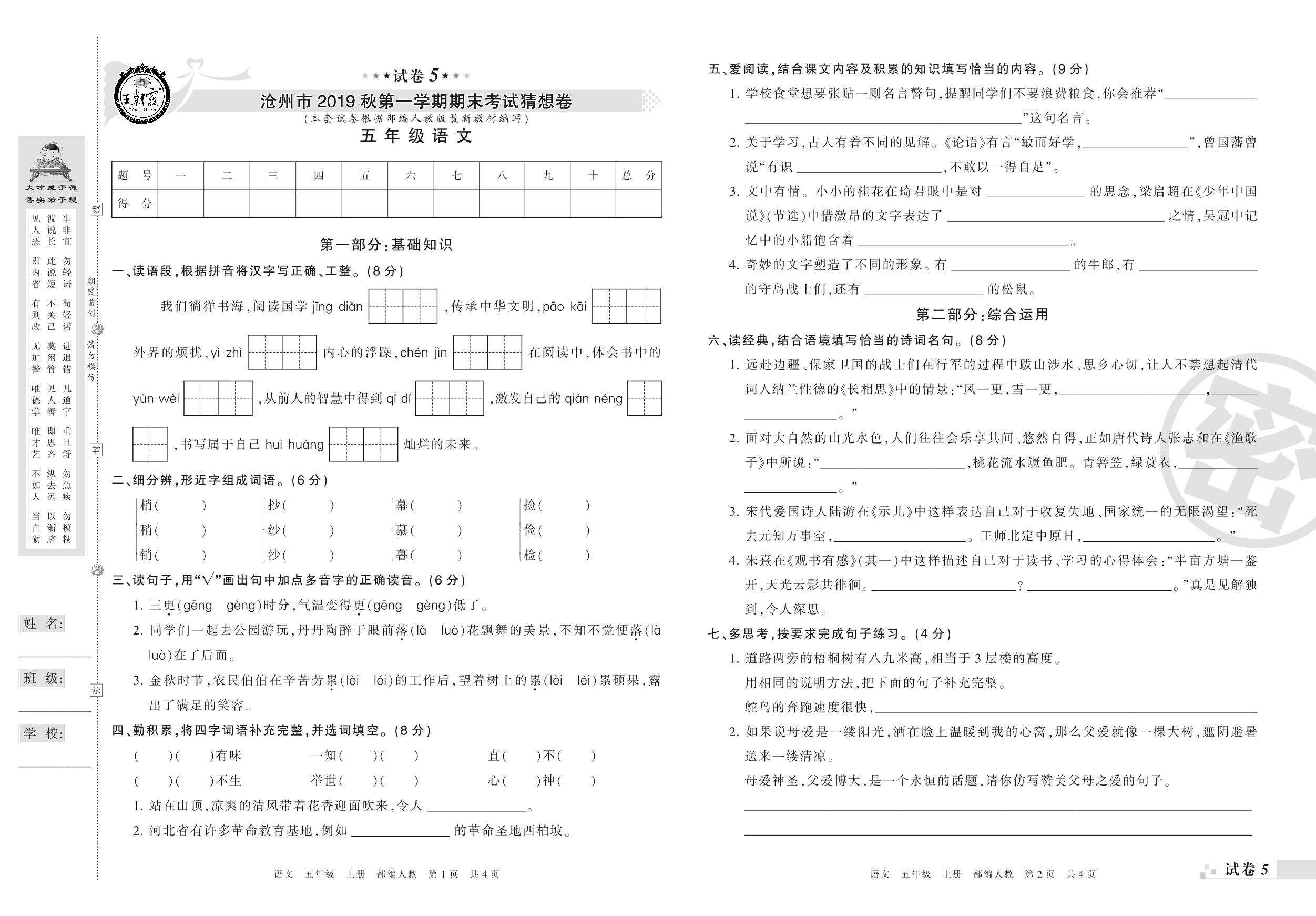 2019-2020学年第一学期沧州市猜想卷五年级语文试卷(人教版)【5】