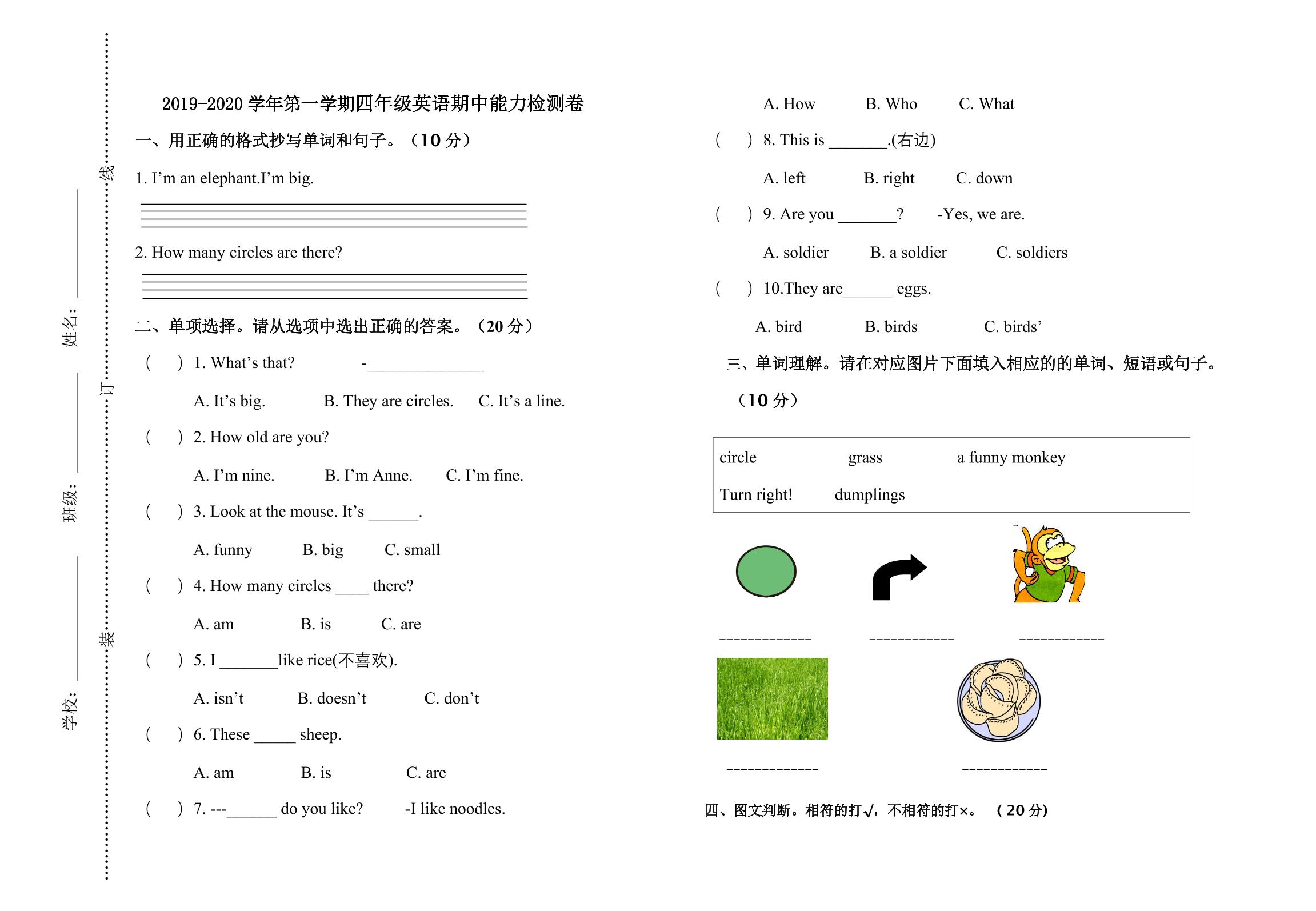 湖南省长沙市宁乡市2019-2020学年第一学期四年级英语期中能力检测卷(湘少版)【无听力音频】