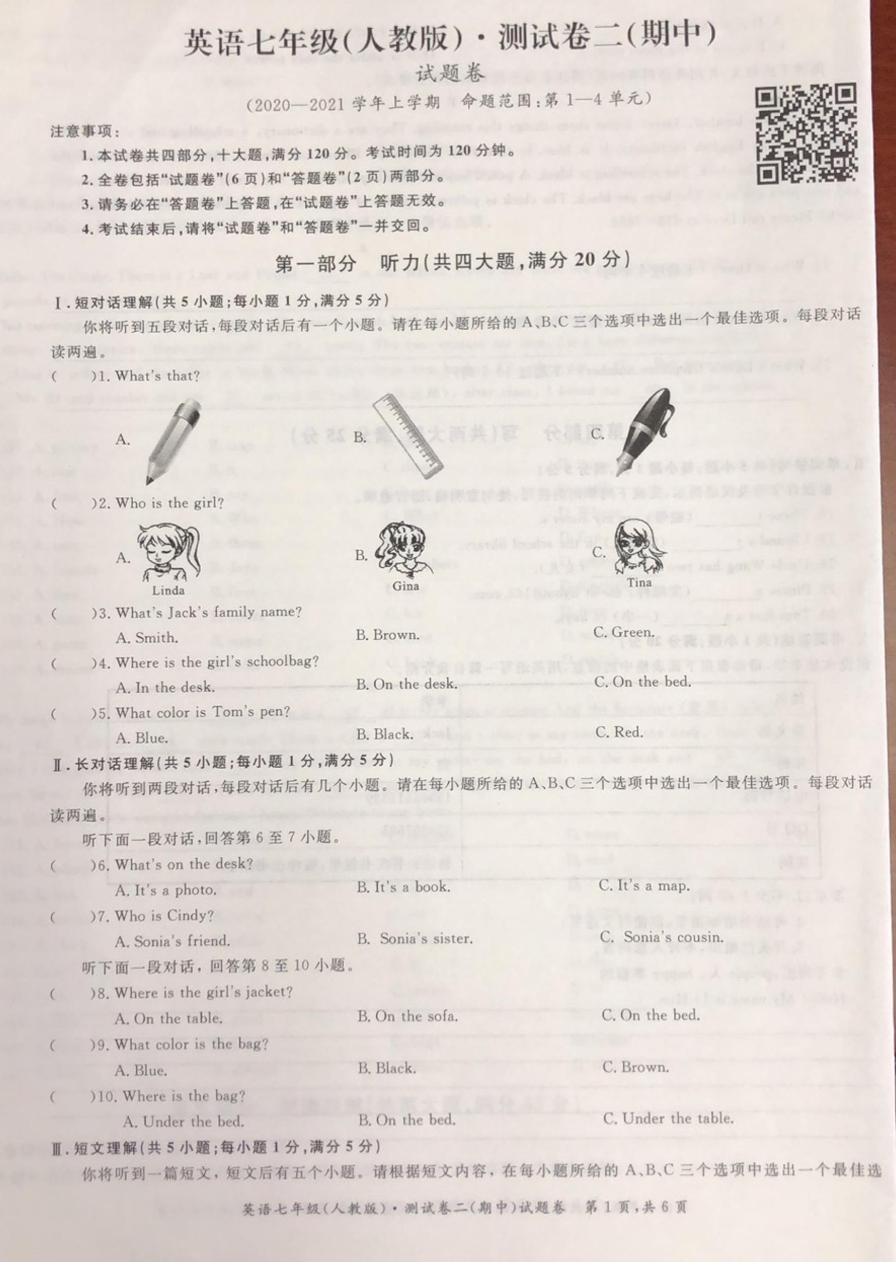 淮北市2020-2021学年上学期英语七年级测试卷二(期中)人教版【无听力音频】