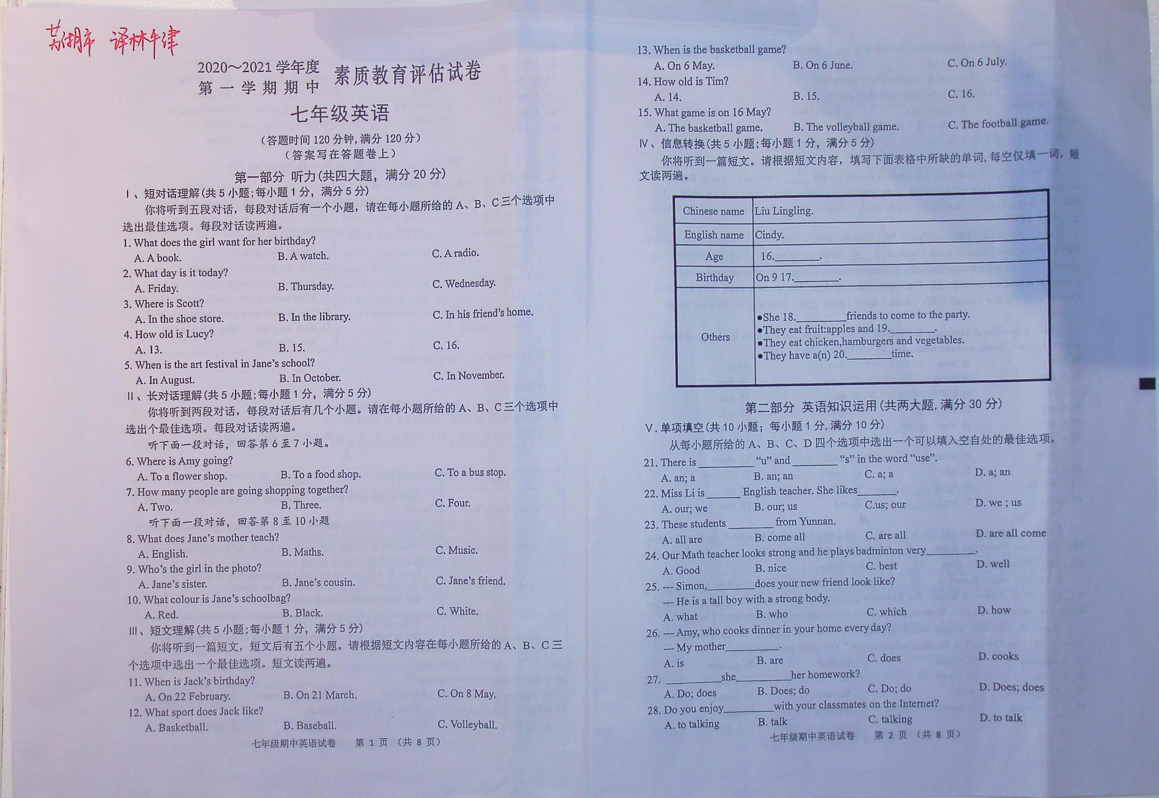 芜湖市2020-2021学年度第一学期期中素质教育评估试卷七年级英语(译林牛津版)【无听力音频】