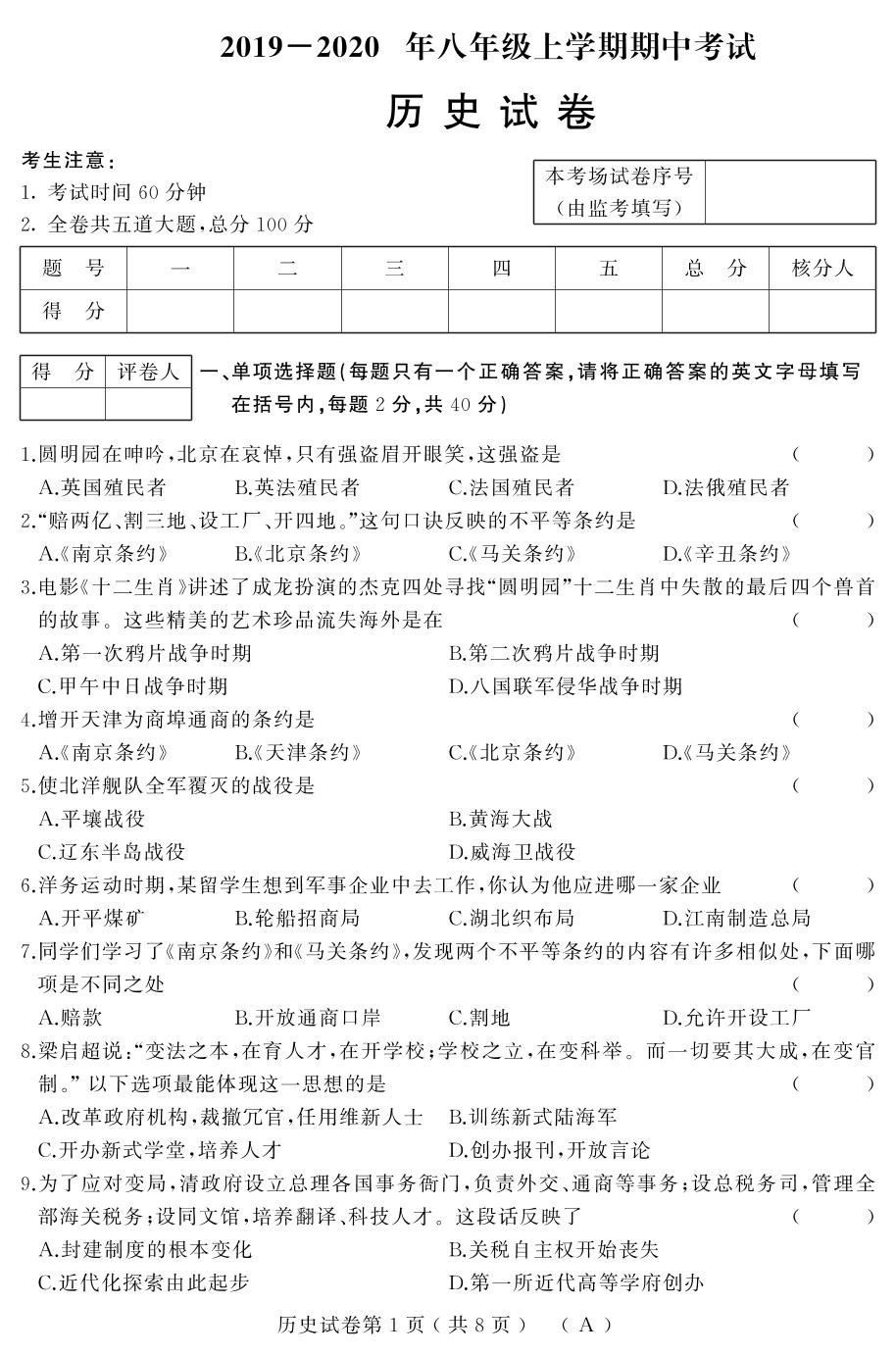 广州市名校联盟2019-2020学年八年级上学期期中考试历史试卷人教版