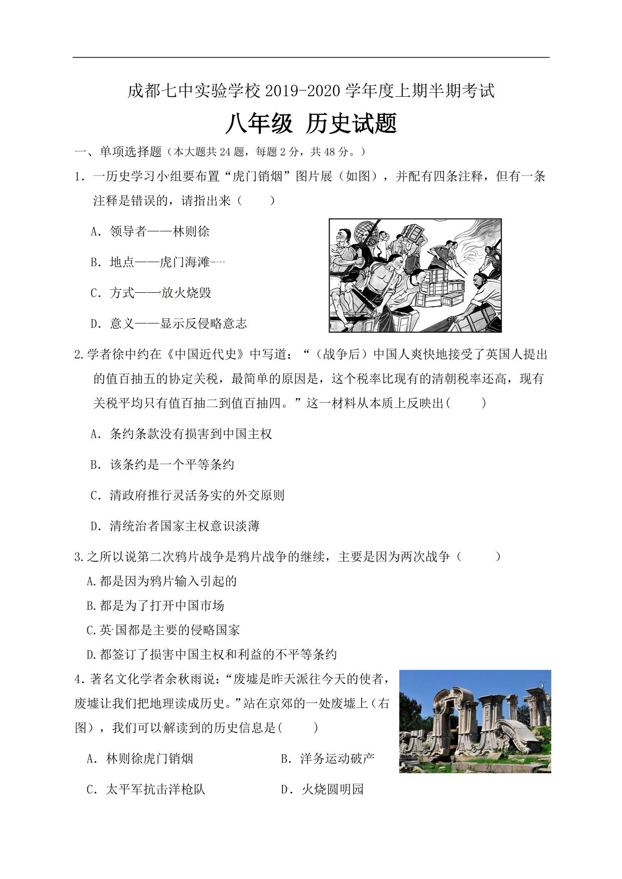 四川省成都七中实验学校2019-2020学年度上期半期考试八年级历史试题人教版