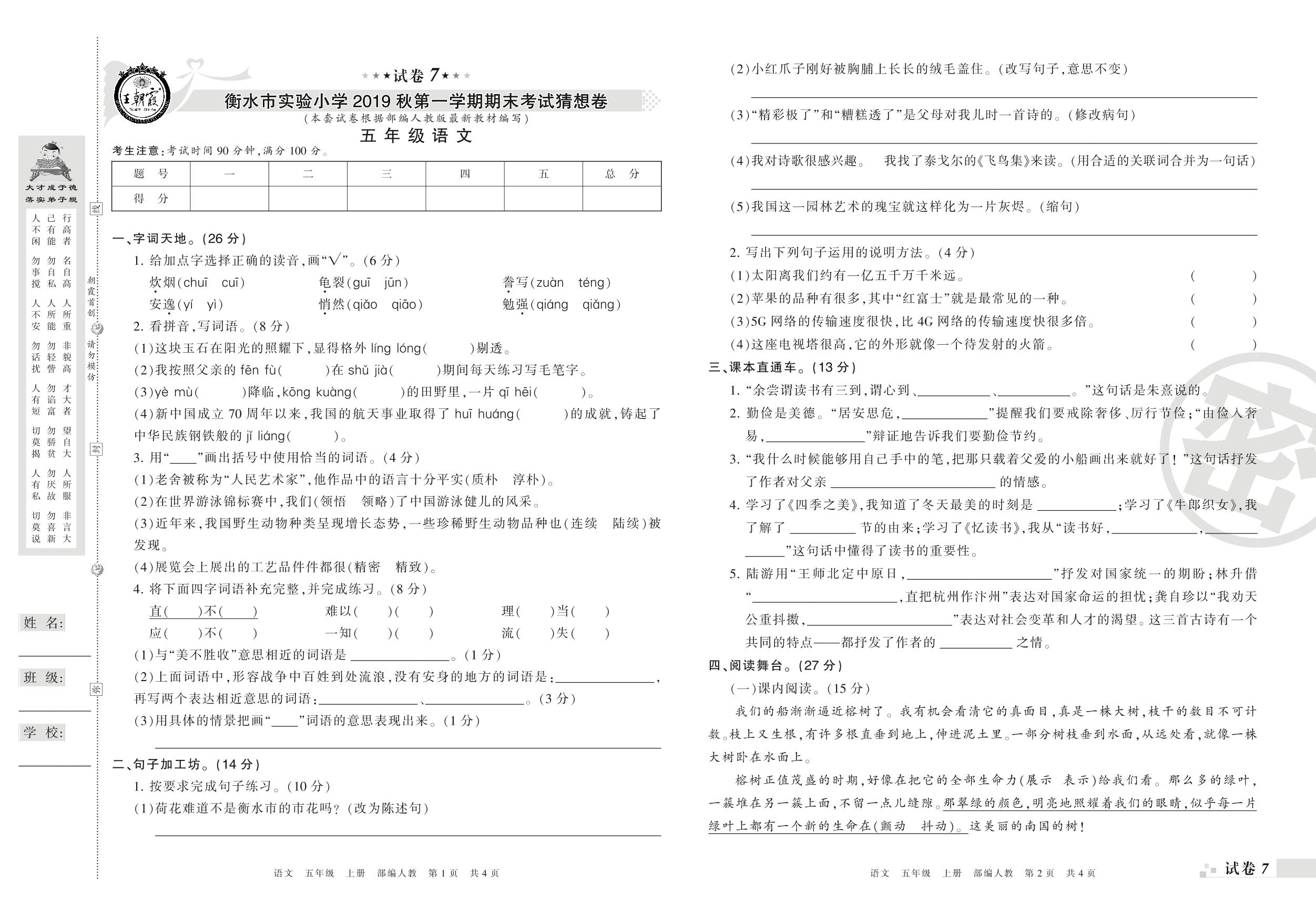 2019-2020学年第一学期衡水市实验小学猜想卷五年级语文试卷(人教版)【7】