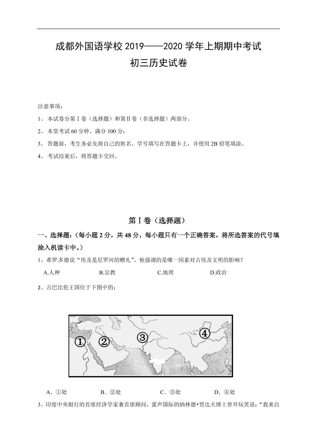 四川省成都外国语学校2019-2020学年上期期中考试初三历史试卷人教版