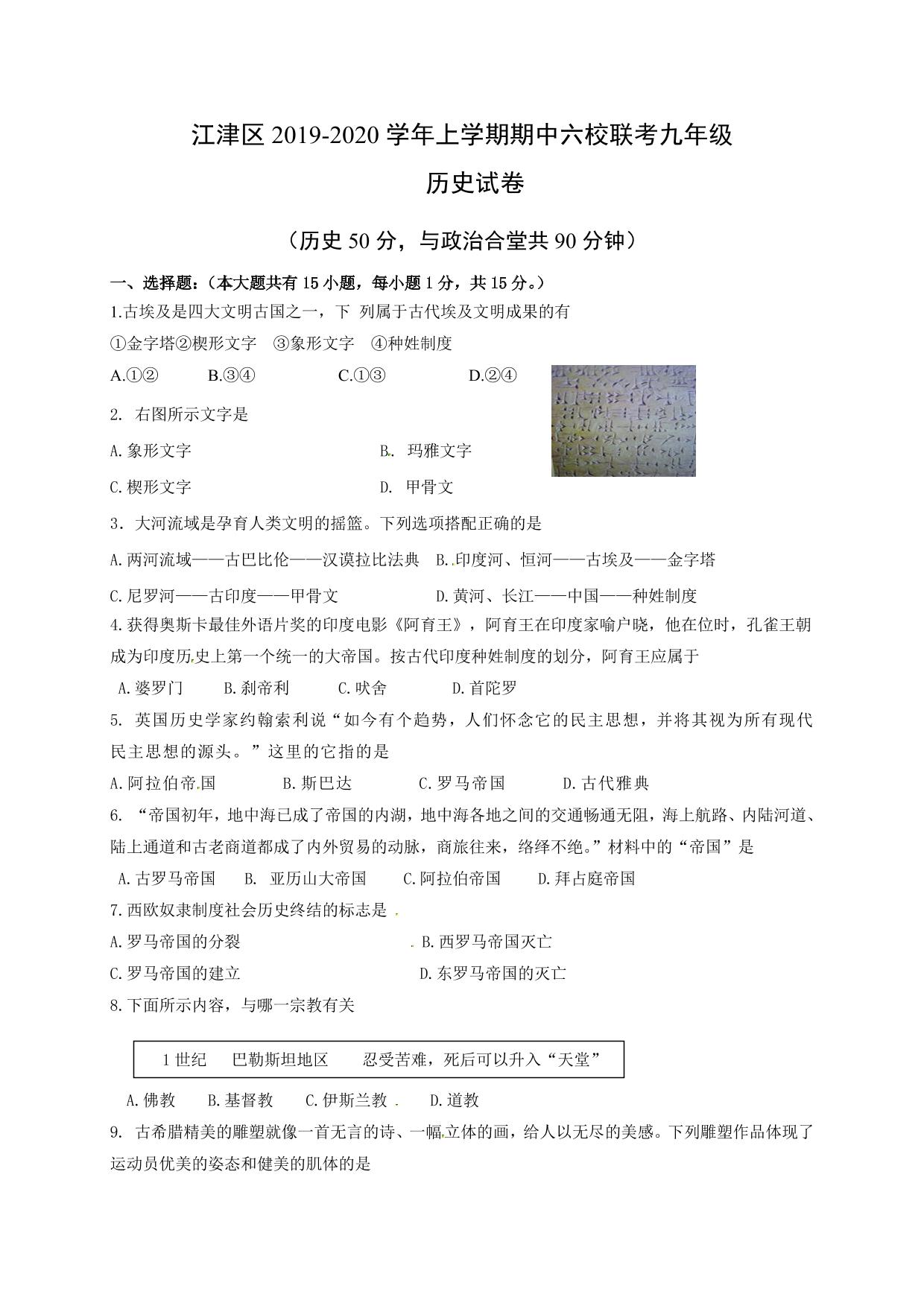 重庆市江津区2019-2020学年上学期期中六校联考九年级历史试卷人教版