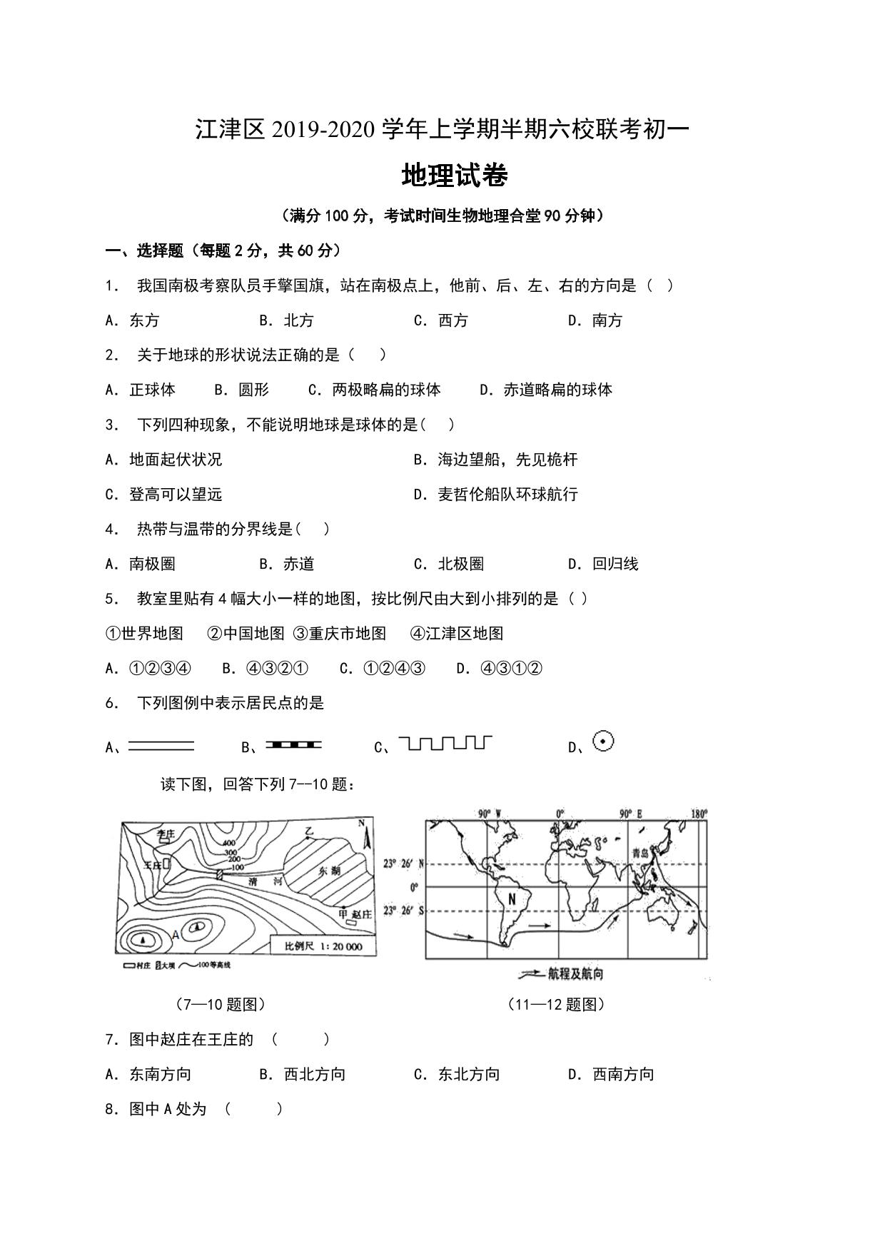 重庆市江津区2019-2020学年上学期半期六校联考初一地理试卷人教版