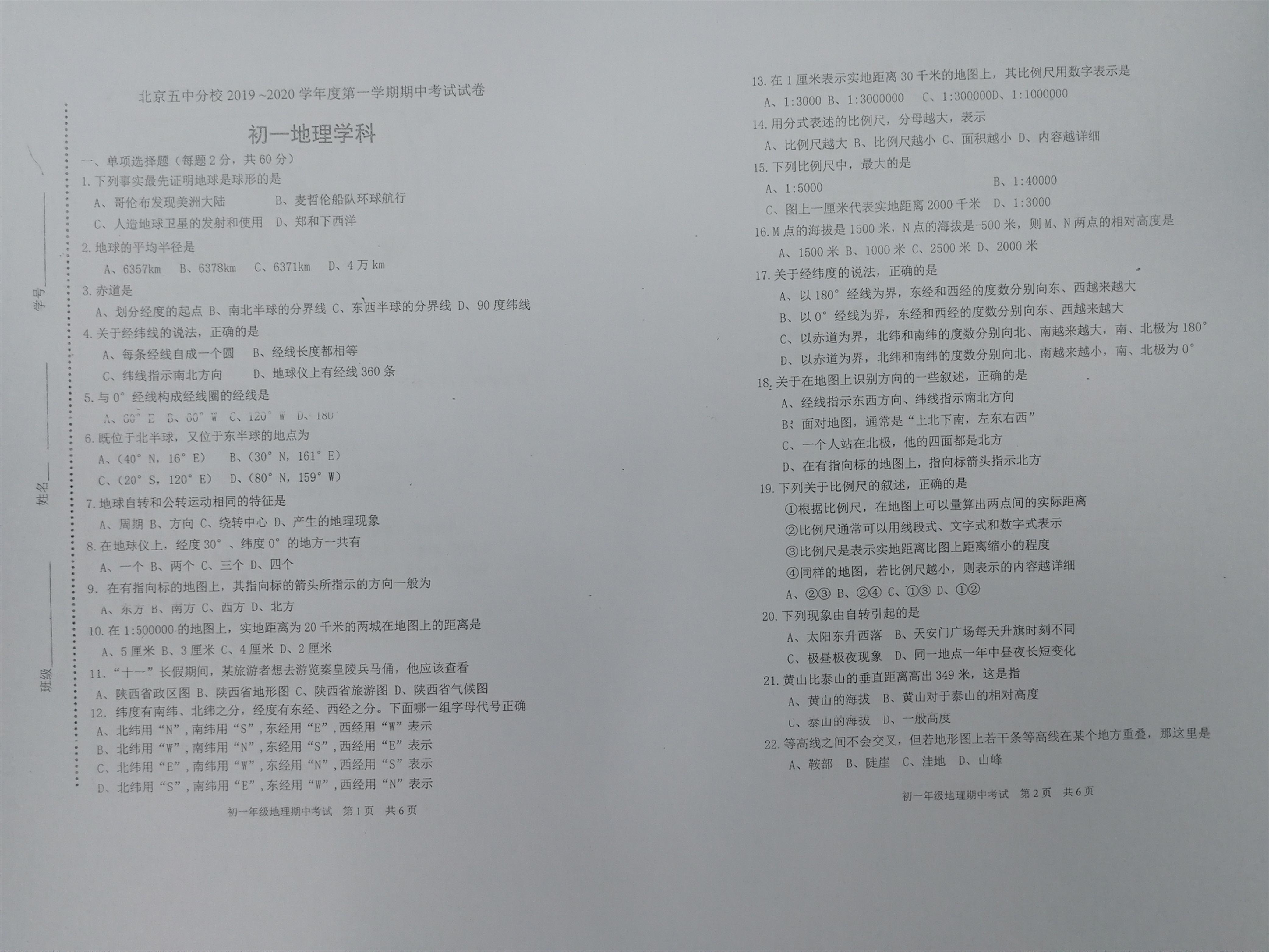 北京市第五中学分校2019-2020学年度第一学期期中考试试卷初一地理学科中图版