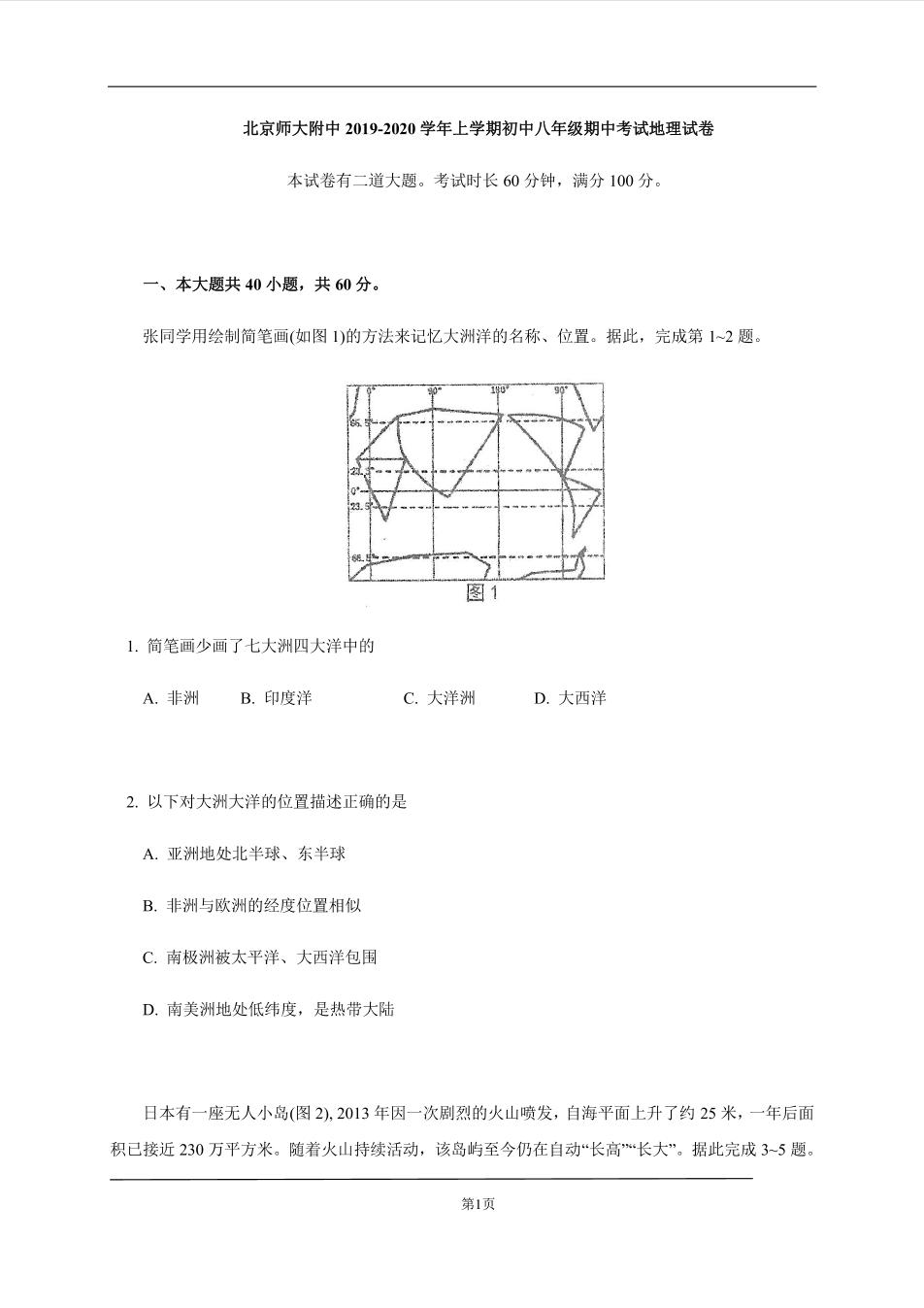 北京师范大学附属中学2019-2020学年上学期初中八年级期中考试地理试卷中图版