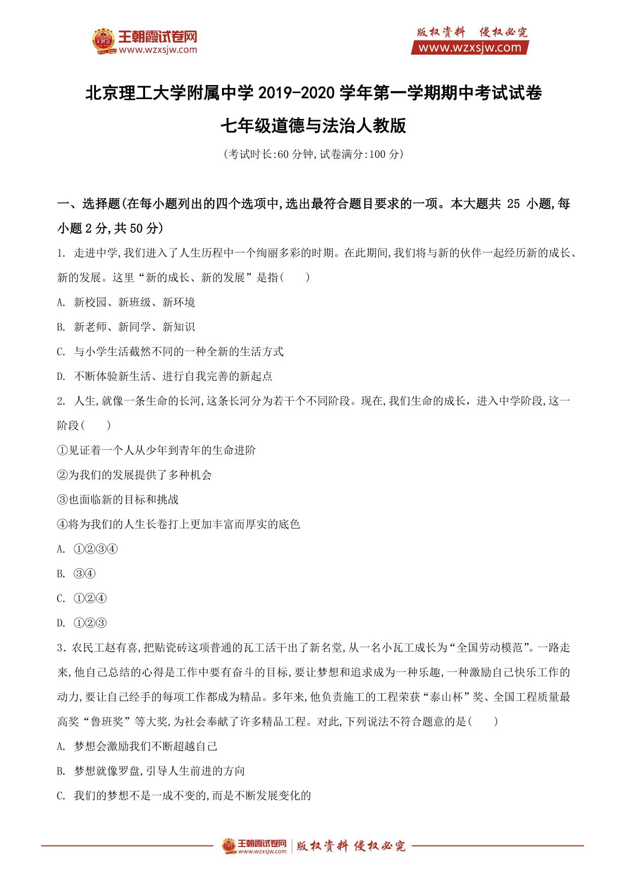 北京理工大学附属中学2019-2020学年度第一学期初一年级道德与法治学科期中考试试卷人教版