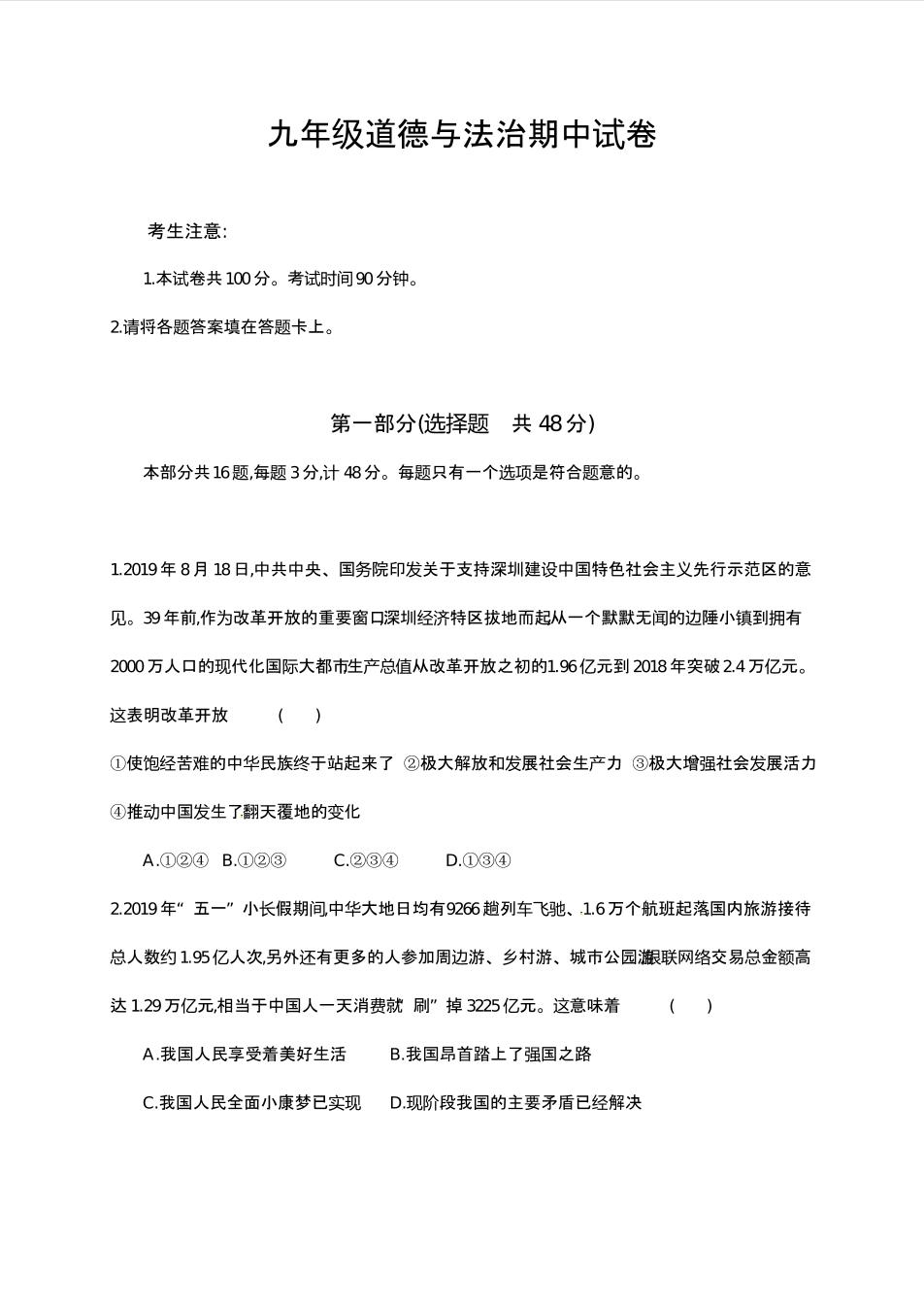 陕西省西安市莲湖区2020届上学期九年级道德与法治期中试卷人教版