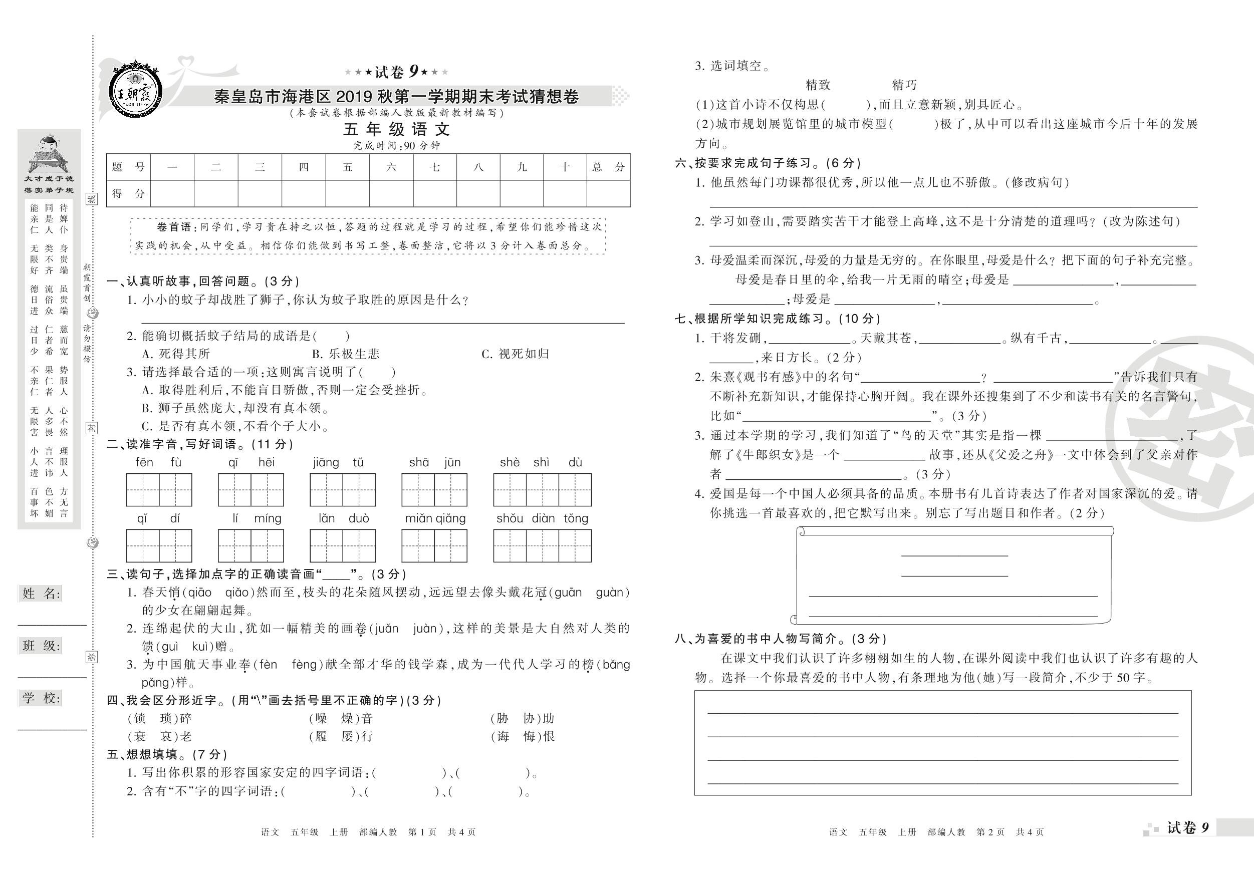 2019-2020学年第一学期秦皇岛市海港区猜想卷五年级语文试卷(人教版)【9】