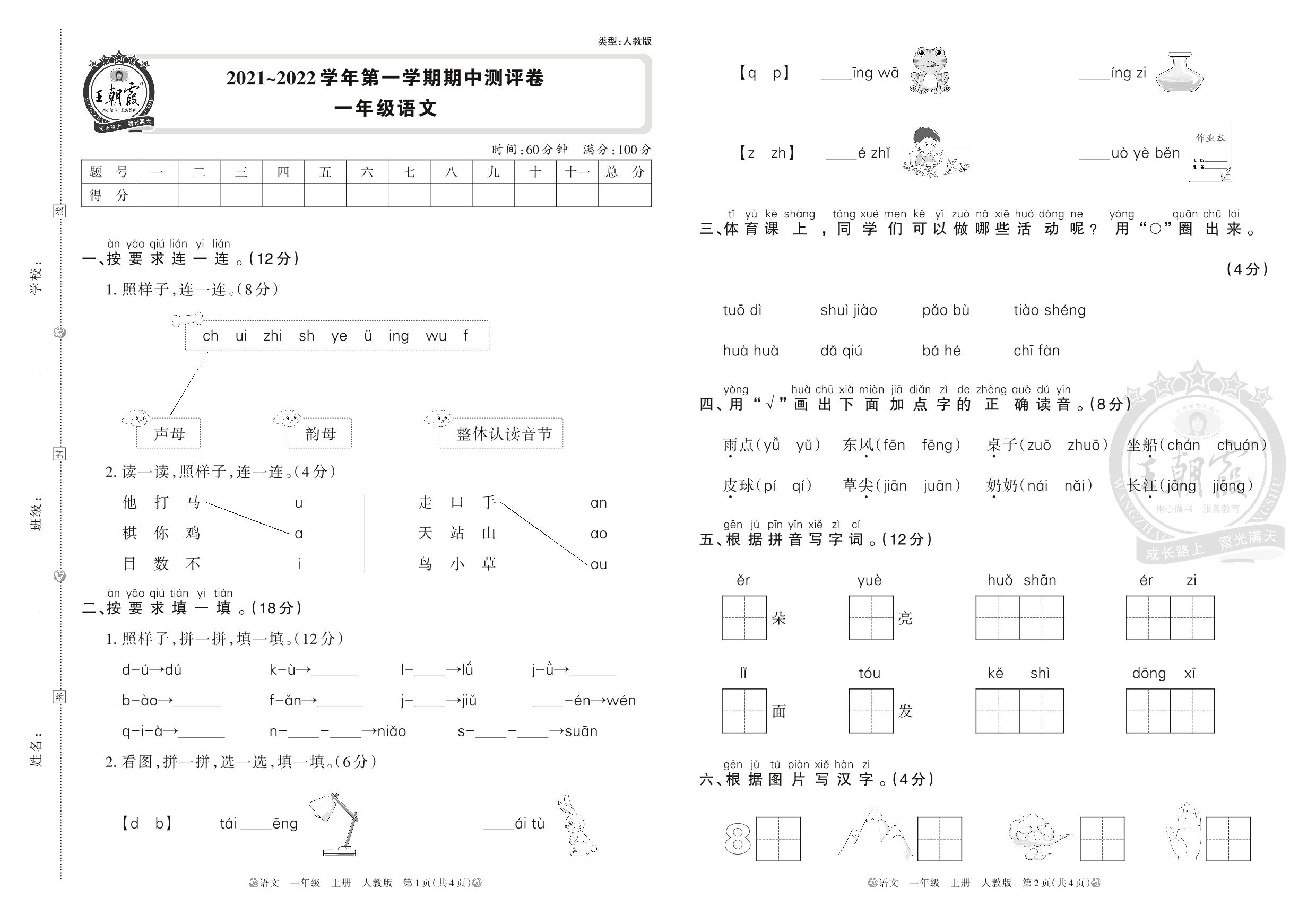 2021~2022学年第一学期期中测评卷 一年级语文(人教版)