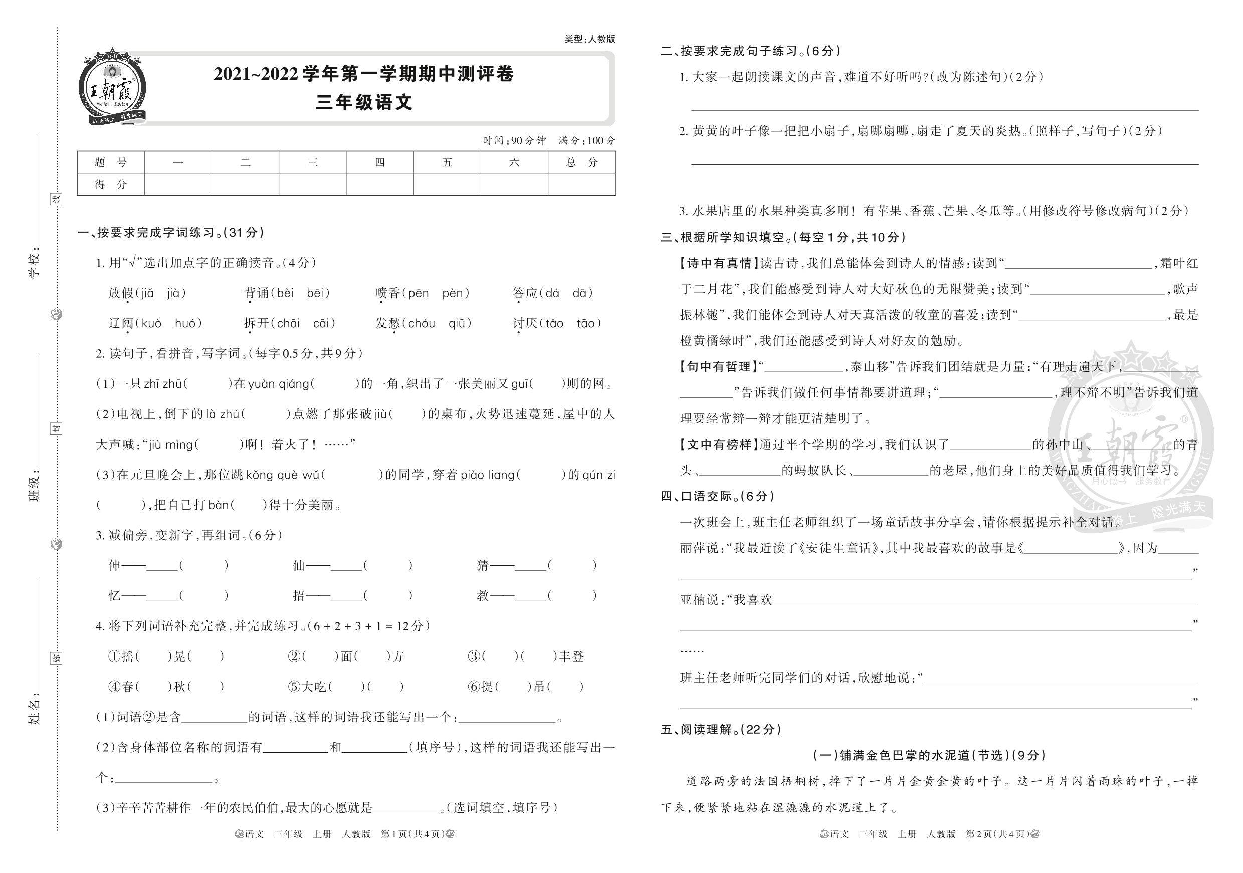 2021~2022学年第一学期期中测评卷 三年级语文(人教版)