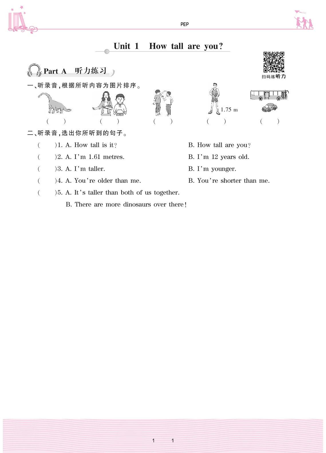 2021下册六年级英语人教PEP版 Unit 1 How tall are you?—Part A 听力练习