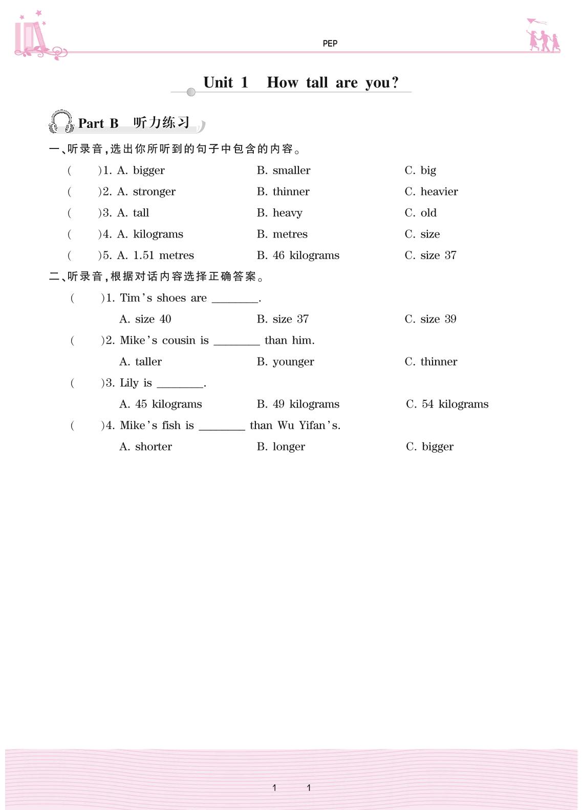 2021下册六年级英语人教PEP版 Unit 1 How tall are you?—Part B 听力练习