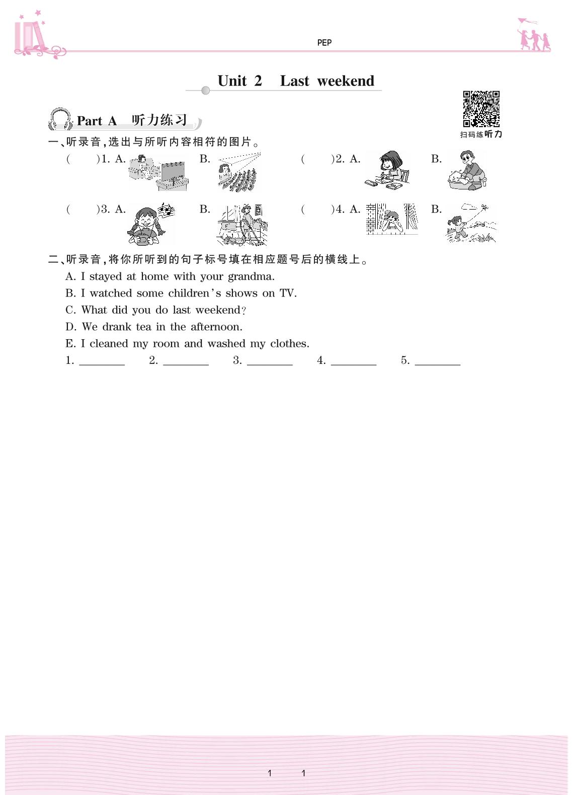 2021下册六年级英语人教PEP版 Unit 2 Last weekend—Part A 听力练习