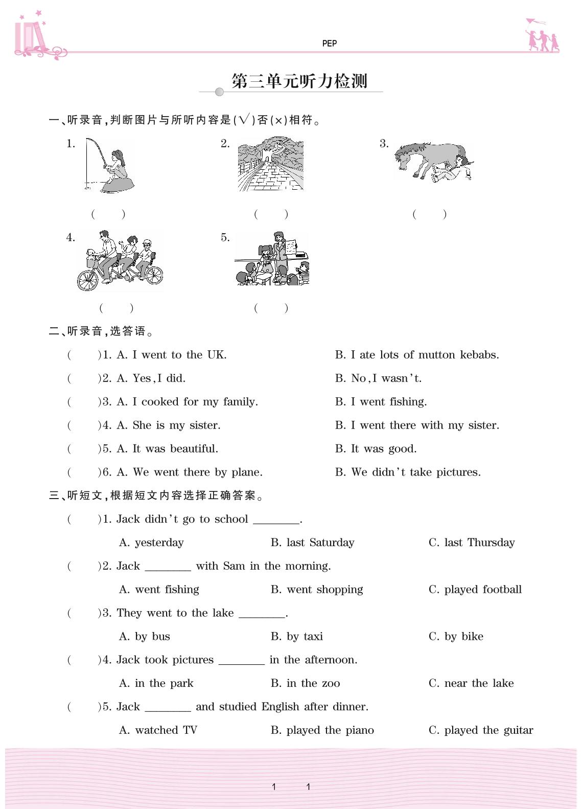 2021下册六年级英语人教PEP版 Unit 3 Where did you go?—第三单元听力检测