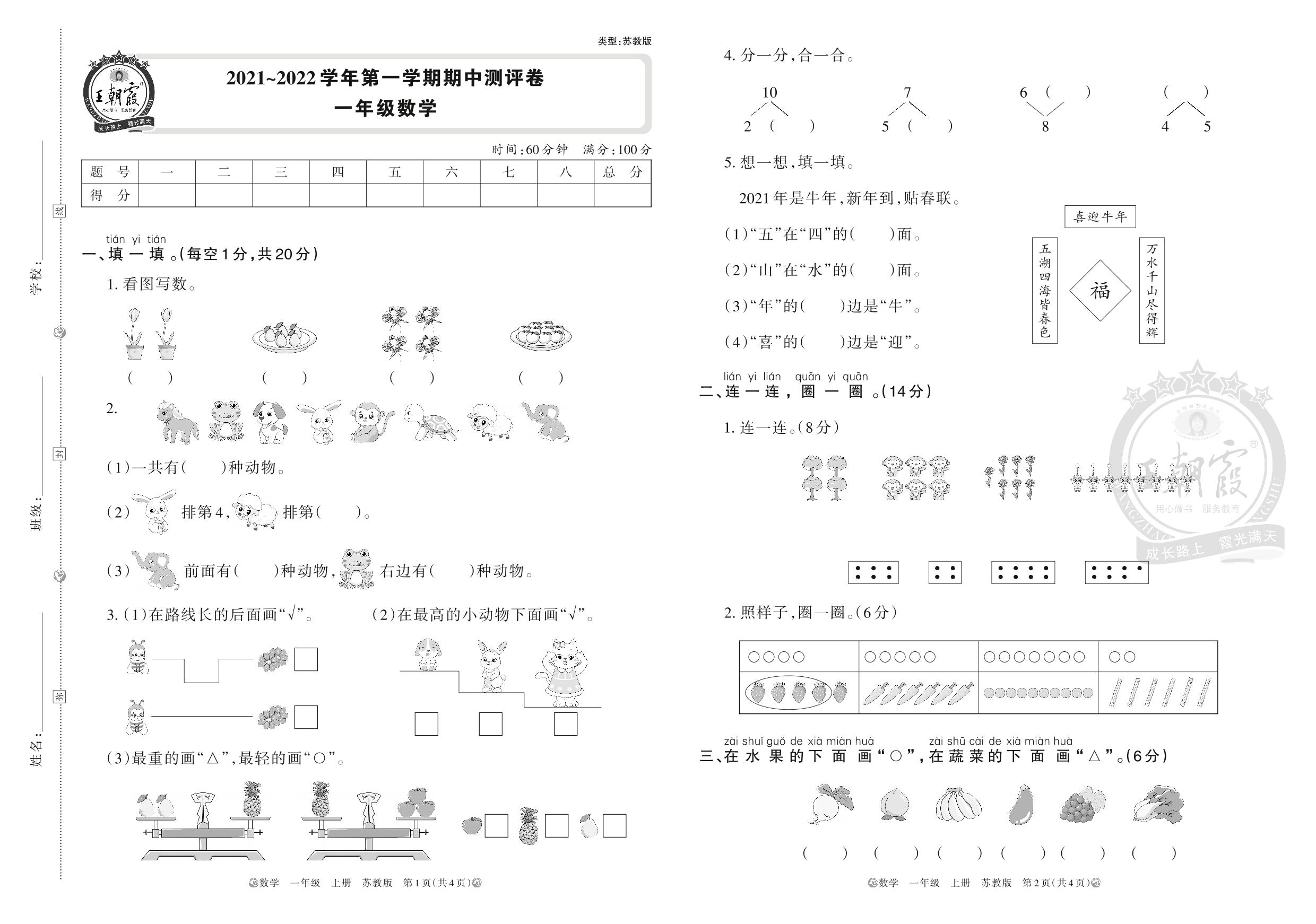 2021~2022学年第一学期期中测评卷一年级数学(苏教版)