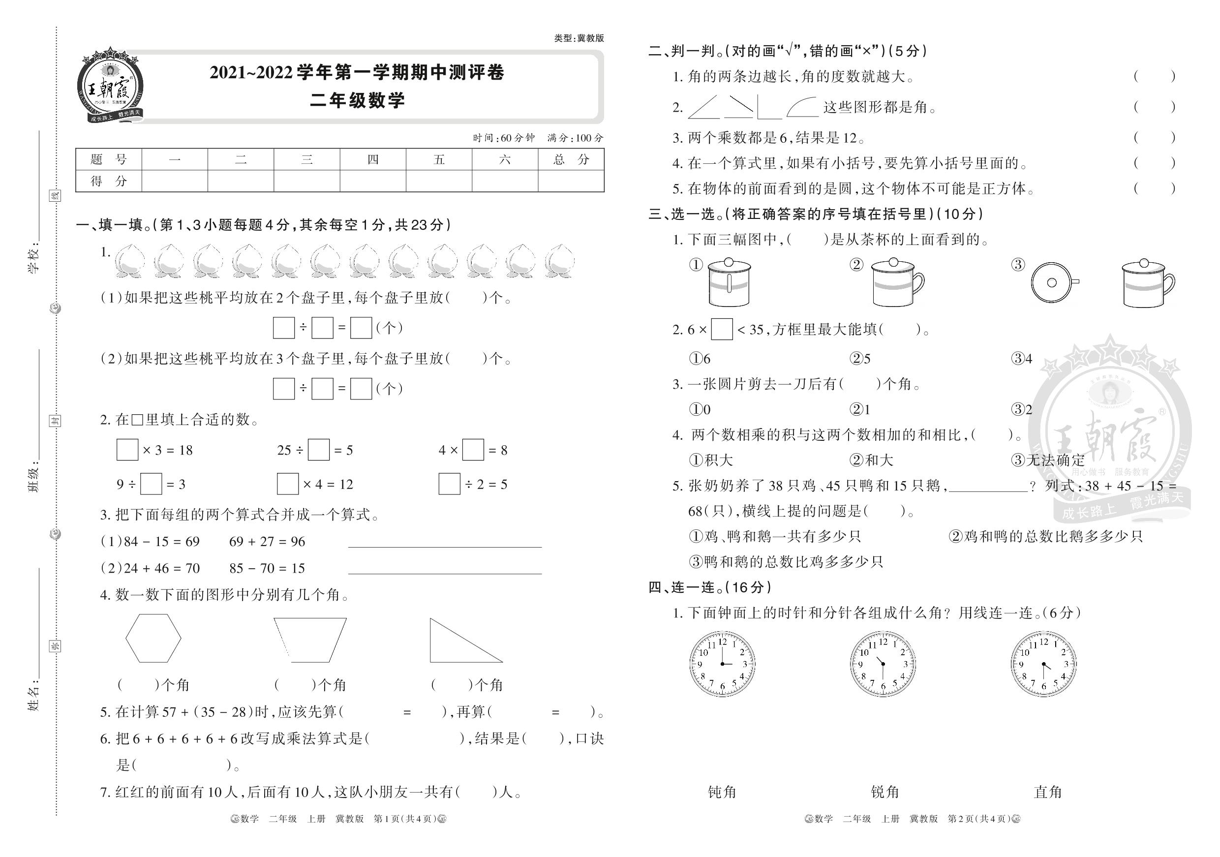 2021~2022学年第一学期期中测评卷二年级数学(冀教版)