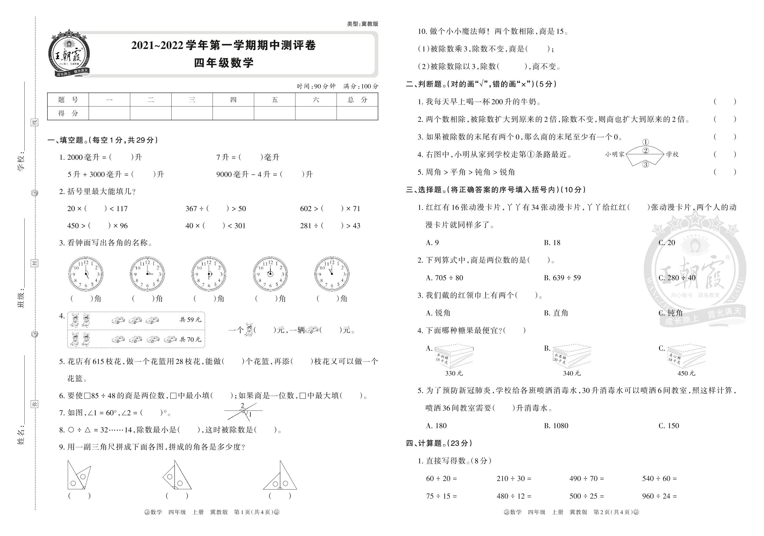 2021~2022学年第一学期期中测评卷 四年级数学(冀教版)