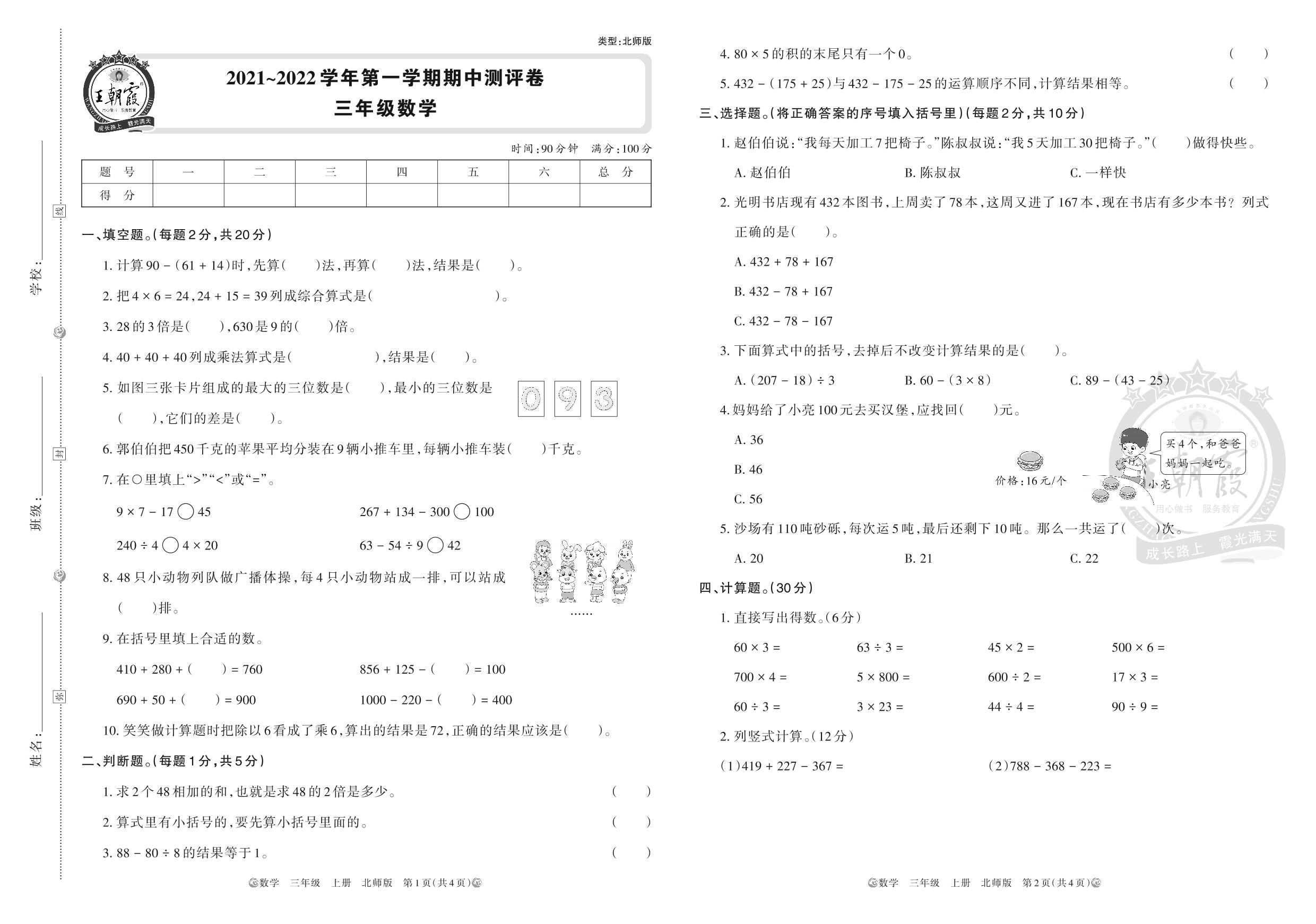 2021~2022学年第一学期期中测评卷三年级数学(北师版)