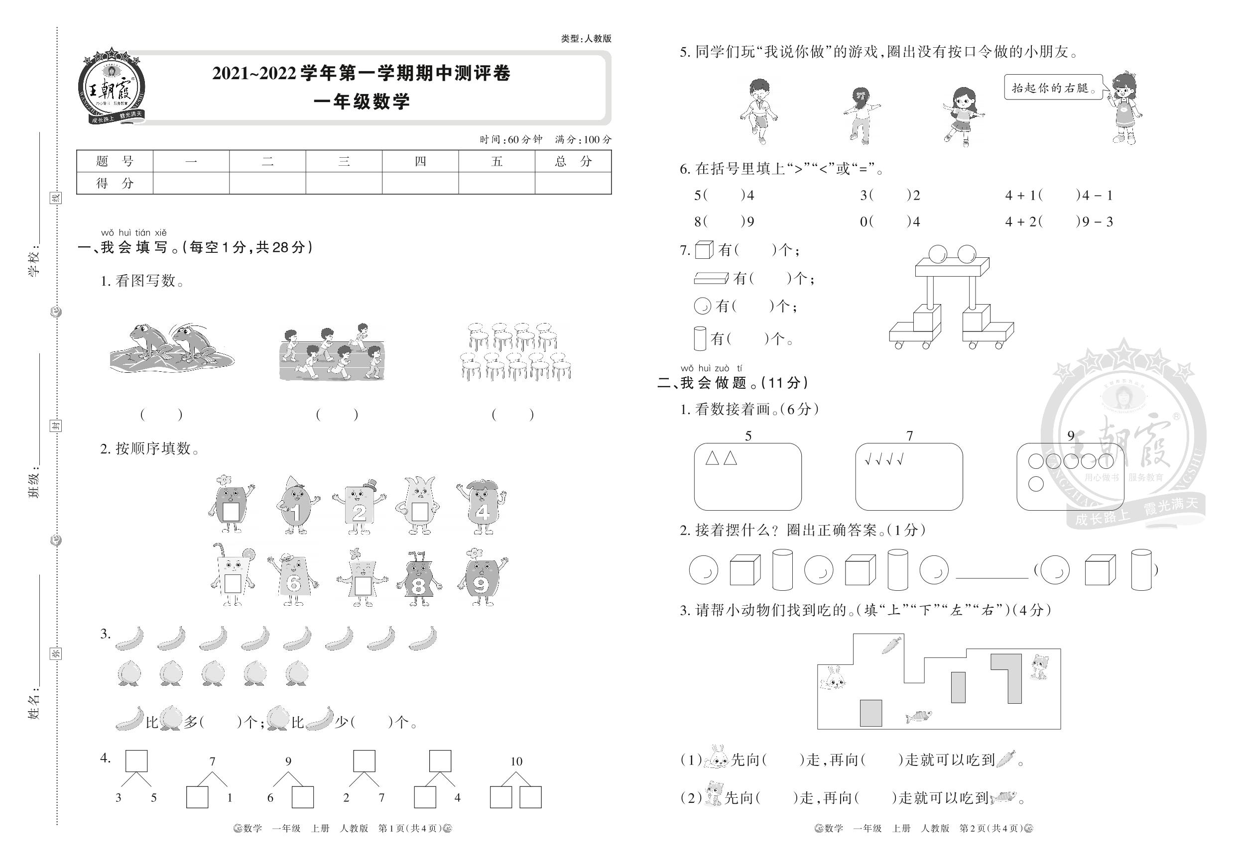 2021~2022学年第一学期期中测评卷一年级数学(人教版)
