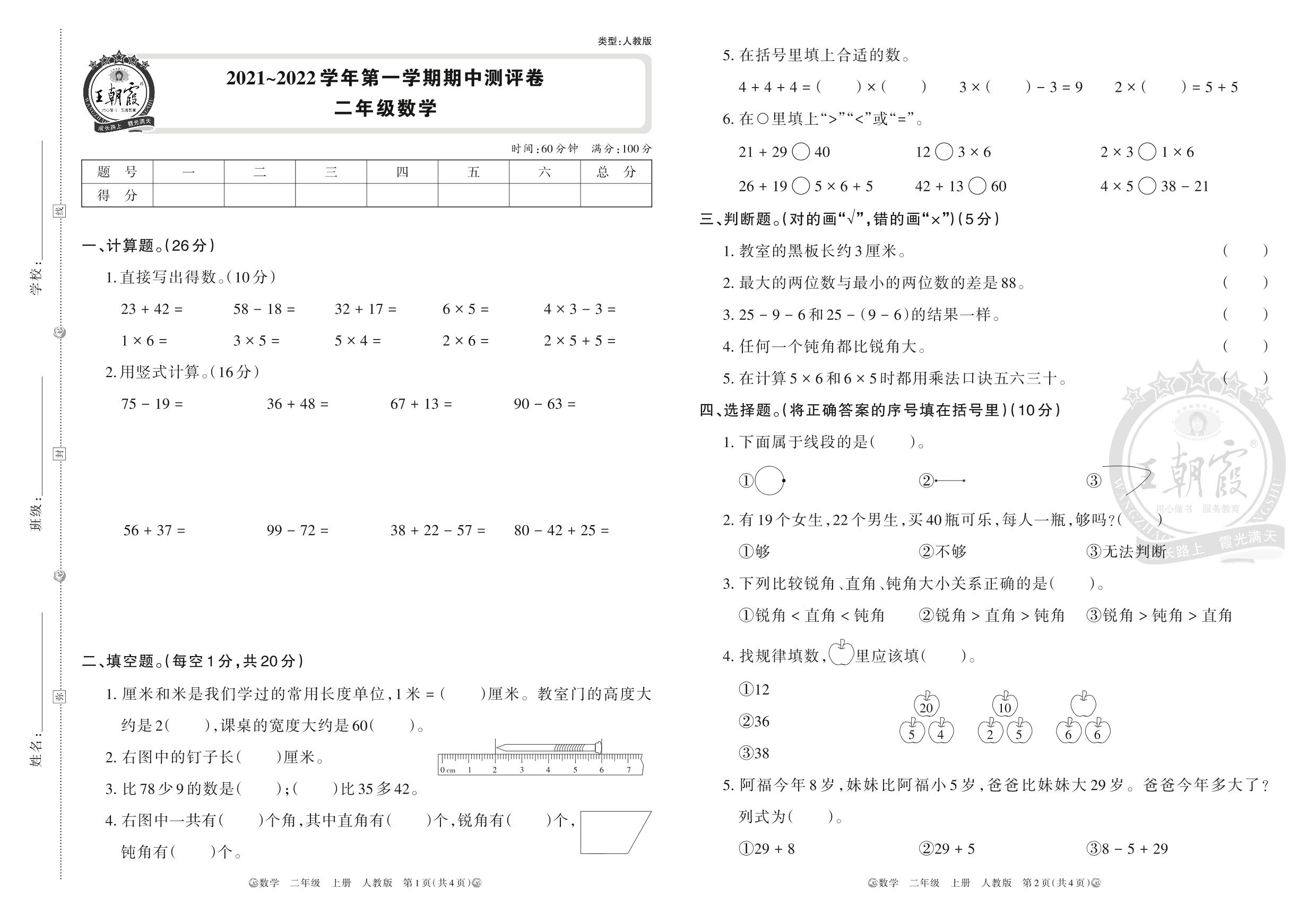 2021~2022学年第一学期期中测评卷二年级数学(人教版)