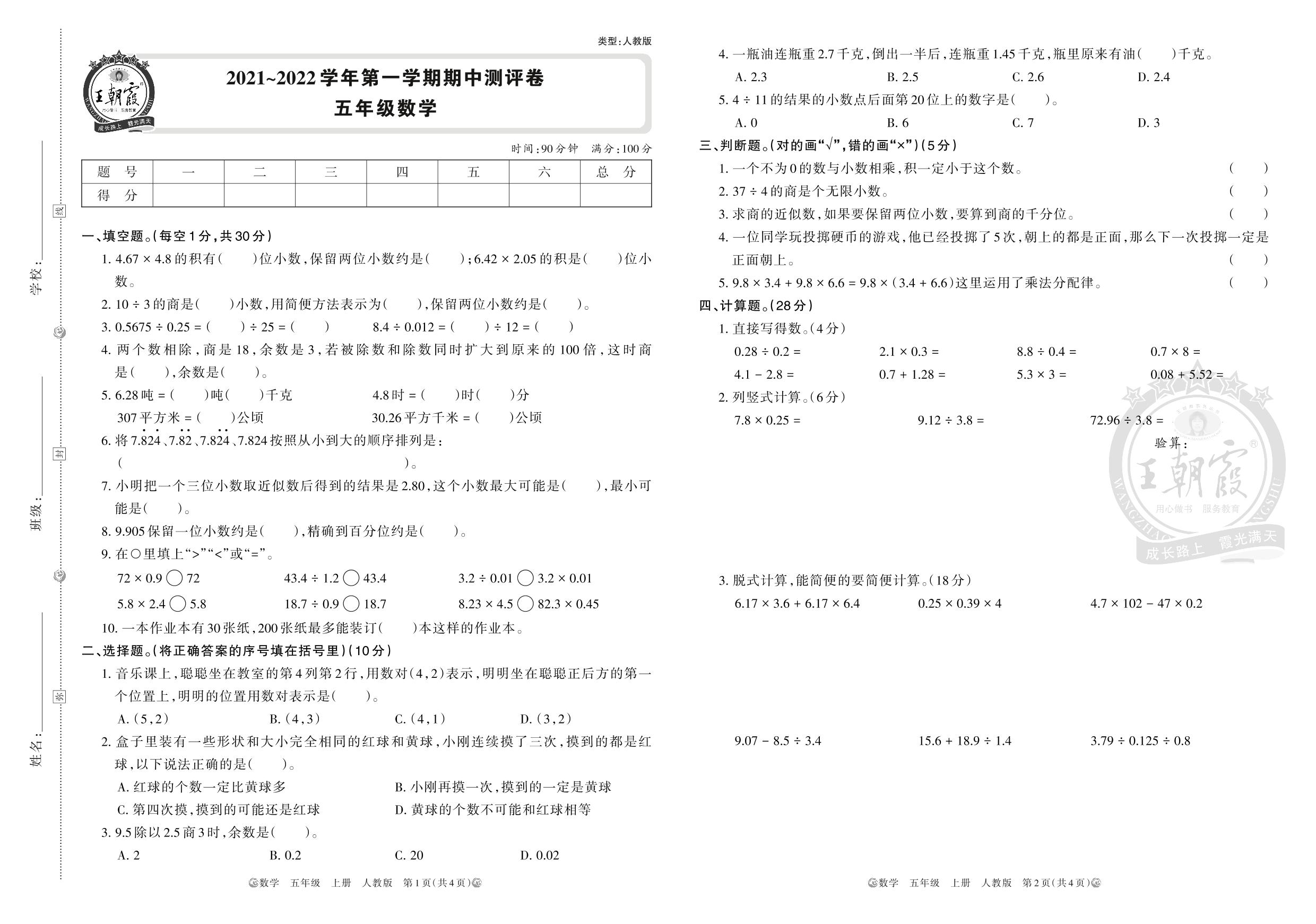 2021~2022学年第一学期期中测评卷 五年级数学(人教版)