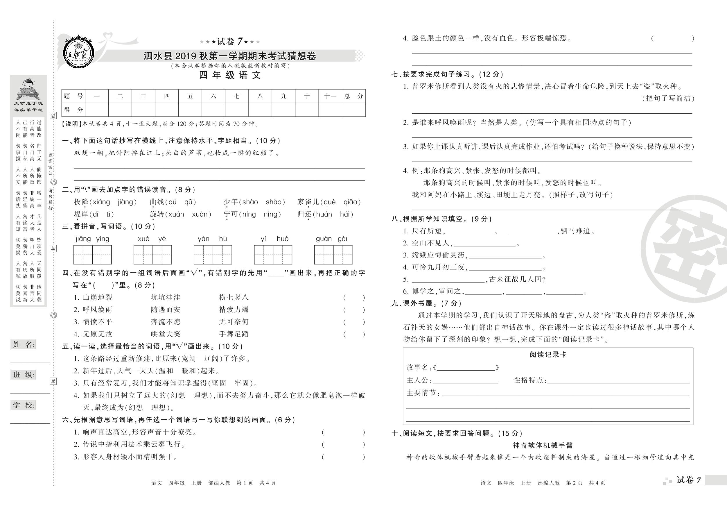 2019-2020学年第一学期济宁市泗水县猜想卷四年级语文试卷(人教版)【7】