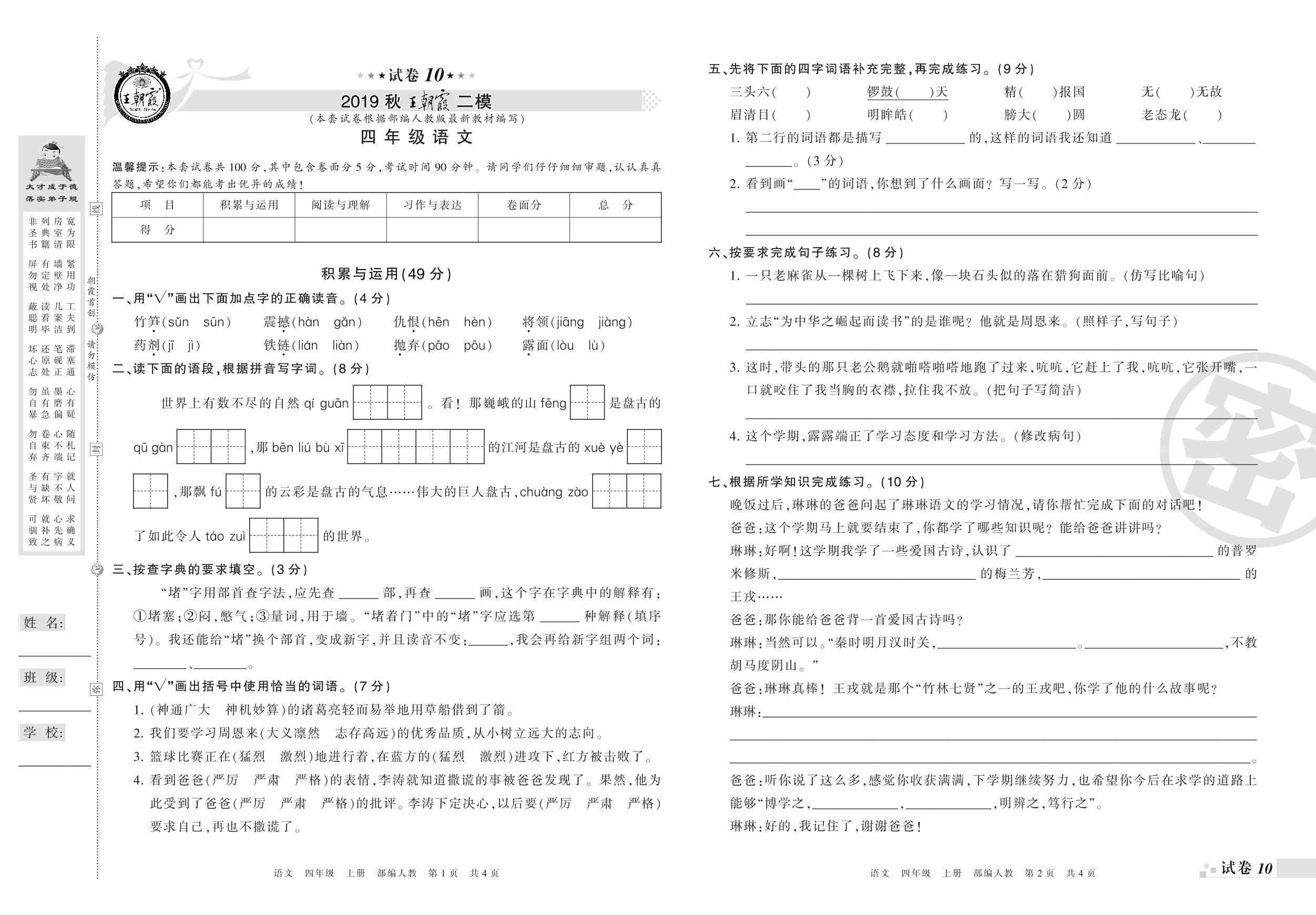 王朝霞期末模拟卷四年级上册语文(人教版)_R210801201120【10】