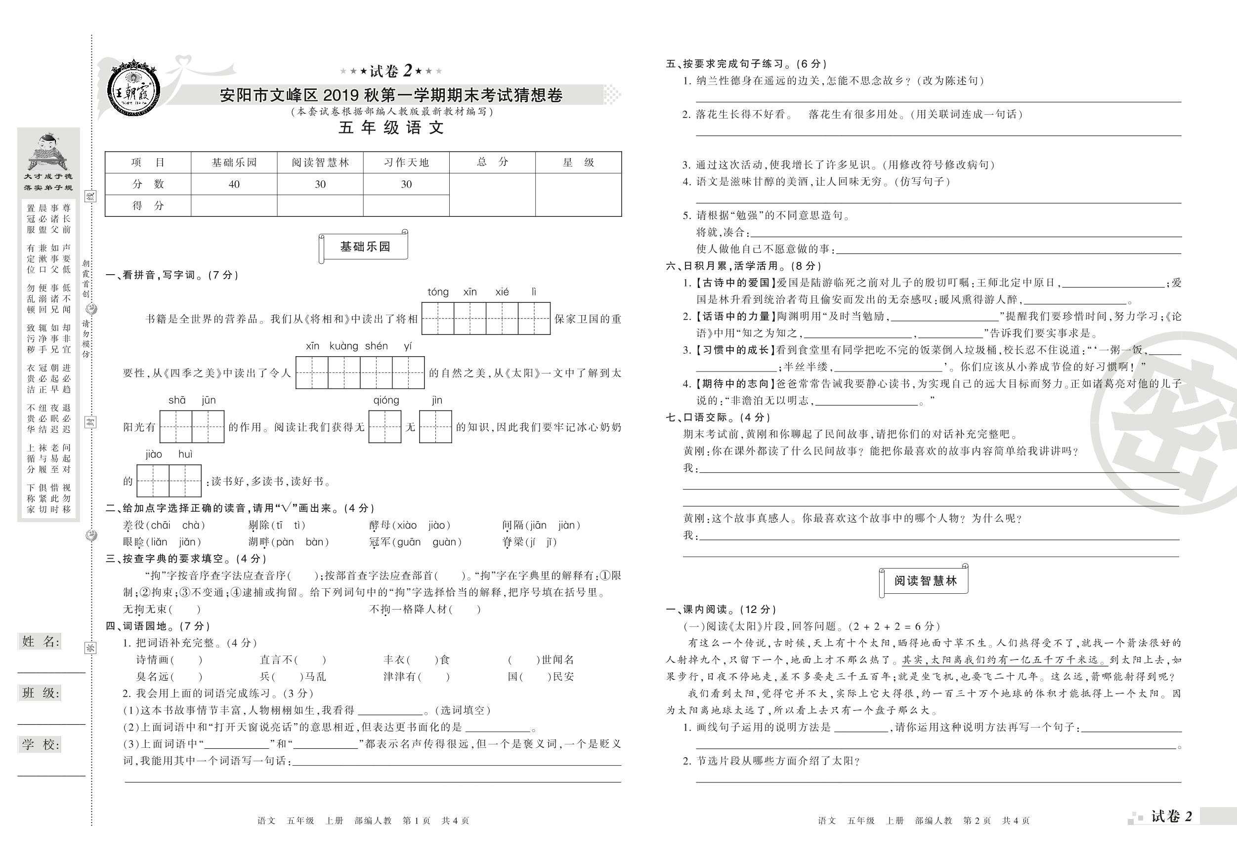 2019-2020学年第一学期安阳市文峰区猜想卷五年级语文试卷(人教版)【2】