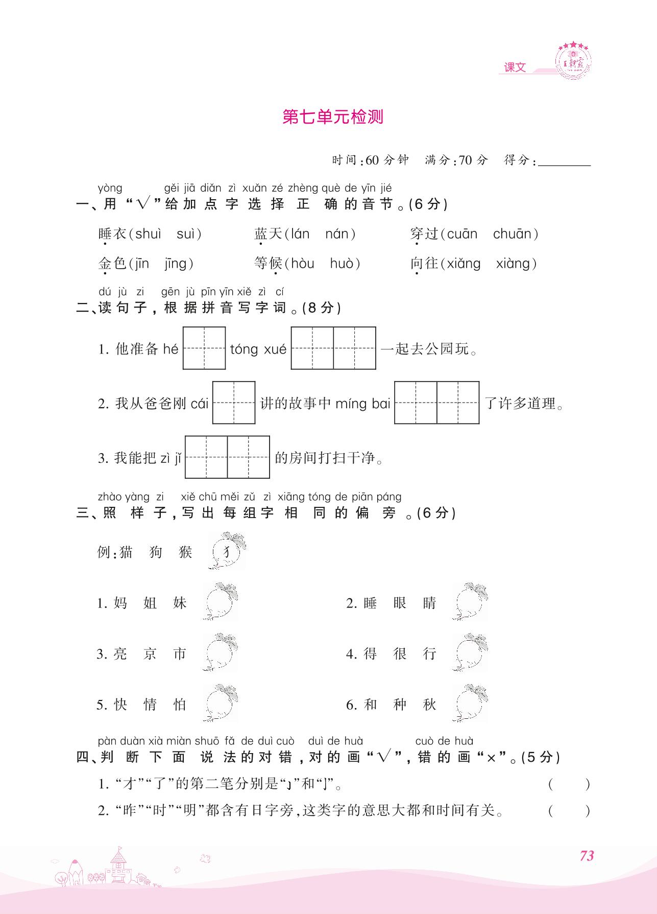 2021上册一年级语文人教版 第七单元检测