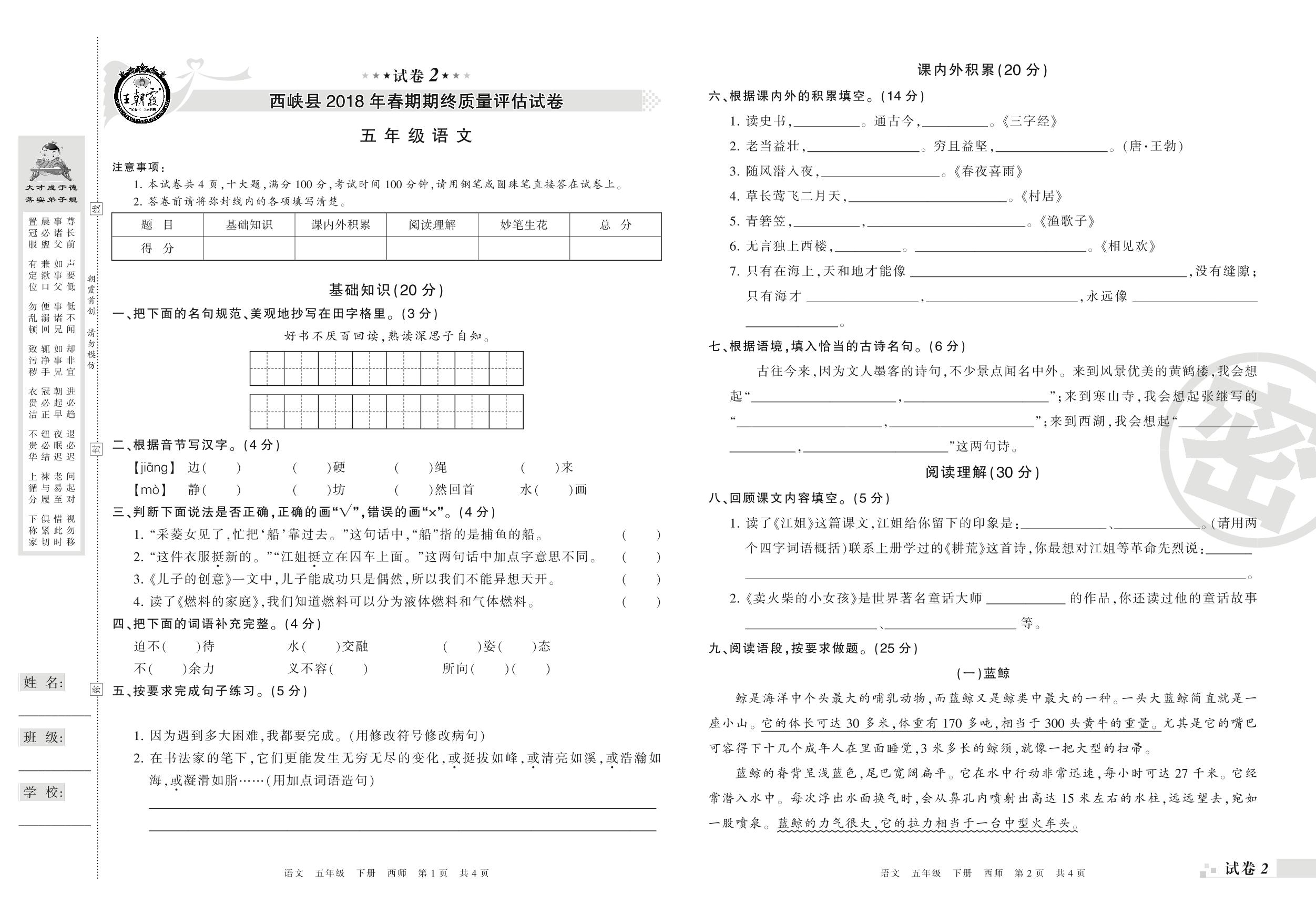 2017-2018学年第二学期南阳市西峡县五年级语文试卷(西师版)【2】