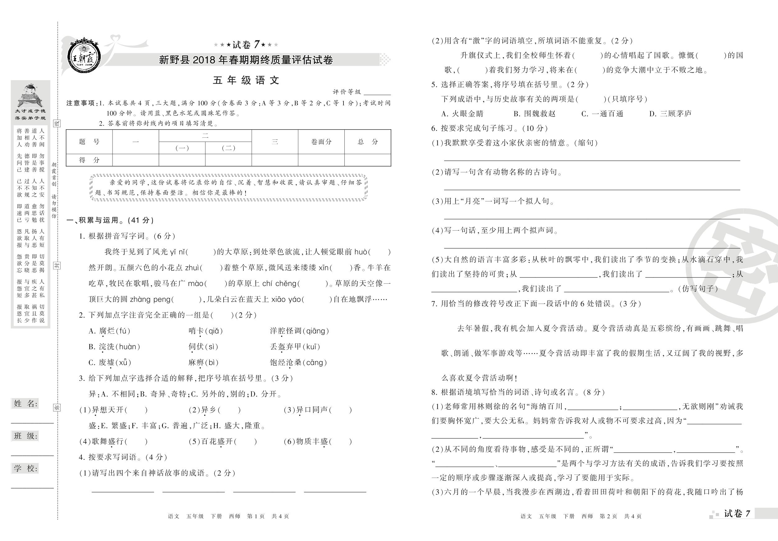2017-2018学年第二学期南阳市新野县五年级语文试卷(西师版)【7】